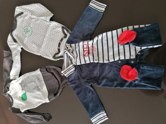 1 pyjamas et 2 bodies taille 12 mois. Comme neuf.
