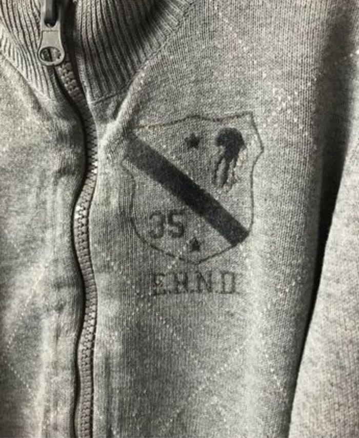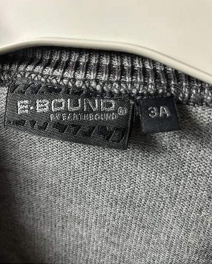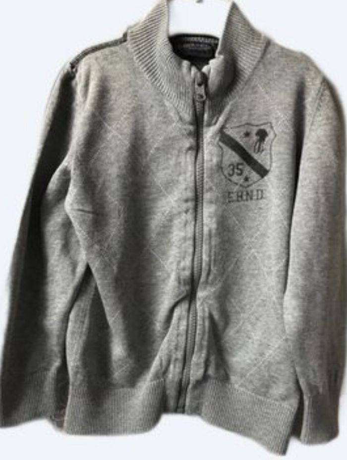 Gilet gris collège écusson poitrine 100% coton taille 3 ans Earthbound toute petite tâche au dessus d’un poignet