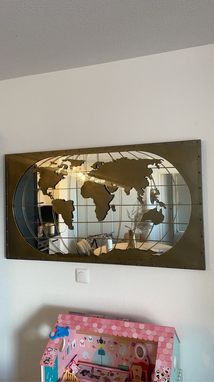 Vends tableau miroir mappemonde en fer doré dimensions : 120x66 cm En très bon état Acheté à Cocktail Scandinave