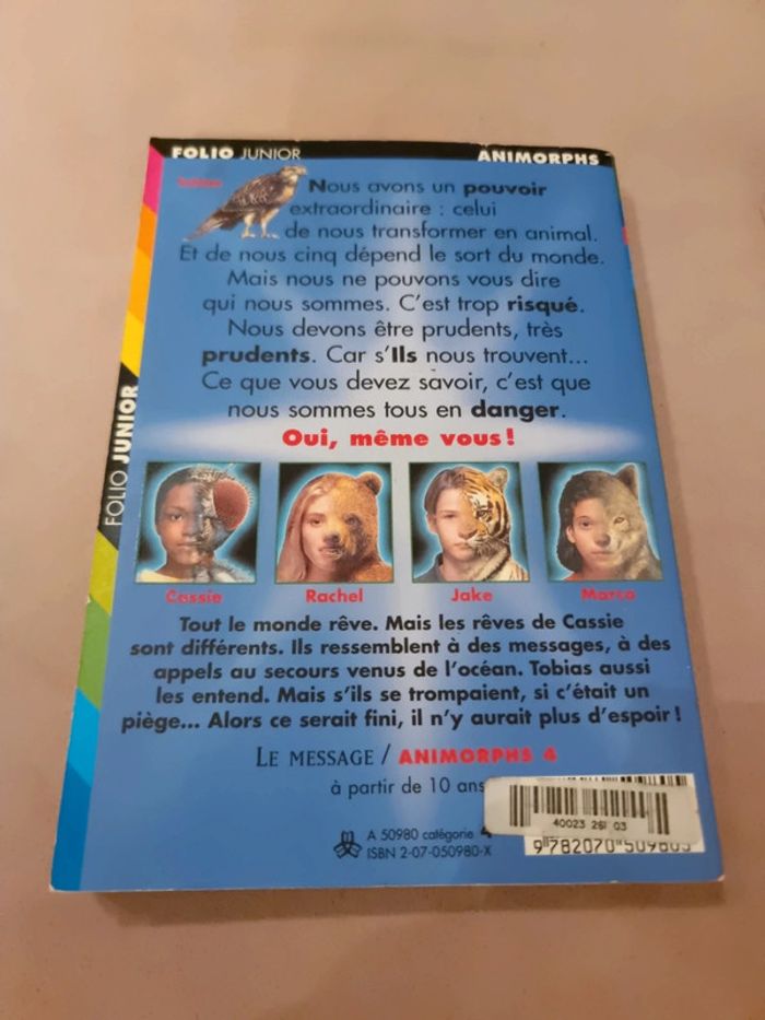 Le message Tome 4 animorphs de K.A. Applegate Collection Folio junior Collection vintage. Dès 1996. Très difficiles à trouver aujourd'hui Animorphs est une série de romans de science-fiction jeur 5 écrite par Katherine Alice Applegate, publiée entre 1996 et L'histoire suit un groupe de cinq adolescents (12 à 14 ans) a d'une technologie Andalite (extraterrestre), la morphose, qui leur permet de se transformer en animaux. I|s entendent ainsi lutter contre l'invasion des Yirks sur Terre, une race extraterrestre de limaces parasites en perpétuelle recherche de nouveaux hôtes, de corps à infiltrer, à contrôler et à réduire en esclavage En très bon état général. Voir photos #angel_livre_enfant