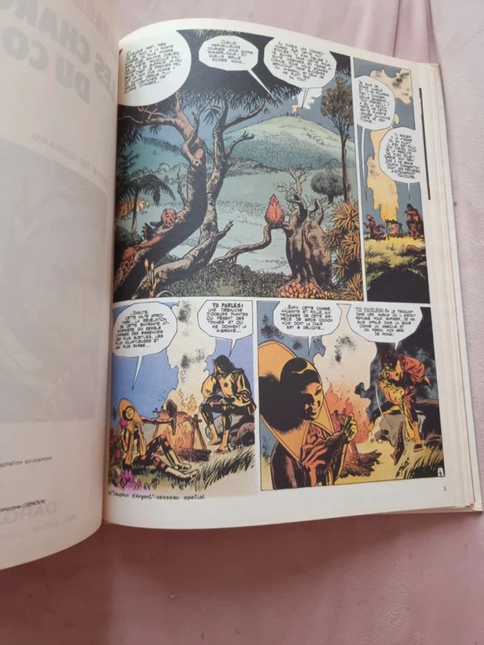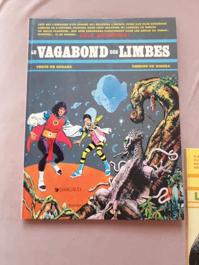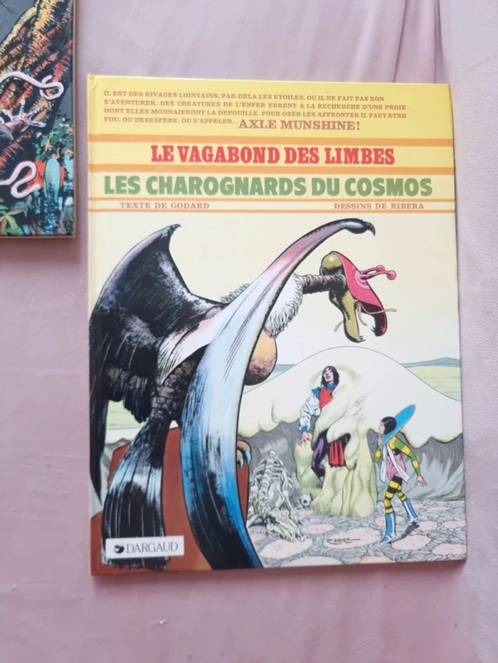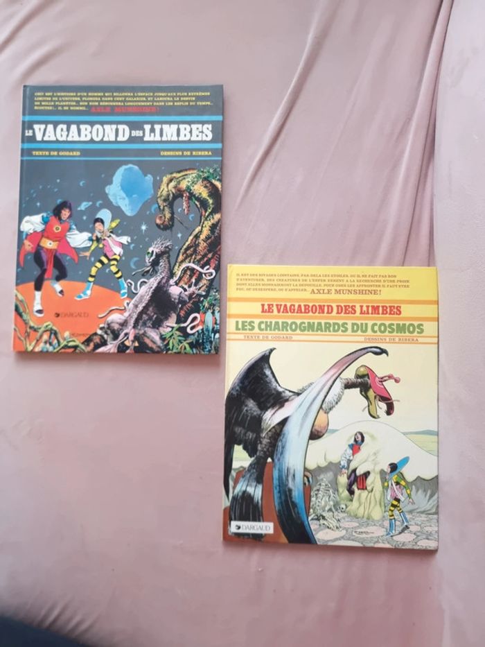 Le vagabond des limbes Texte de Godard Dessins de Ribera Lot de 2 albums BD En très bon état. Voir photos Vintage Tome 1 le vagabond des limbes. 1985. Tome 3 les charognards du cosmos. 1984 Le Vagabond des Limbes est : - une suite épique et foisonnante - une critique cinglante de notre société et de toutes les dérives dont elle est capable. - une tragédie antique et une fable, une série d’action et d’aventures, de science-fiction et de fantastique, d’anticipation et d’humour, un conte de fées cruel et envoûtant aux surprises innombrables, une saga haletante Axle Munshine est un homme envié, privilégié, couvert de gloire et occupant un poste honorable dans sa galaxie. Il a de grandes perspectives de carrière devant lui, car il bénéficie de la sympathie et de la protection du dirigeant de son monde, le Médiat suprême. Axle est un héros, qui a rempli avec honneur et courage de nombreuses missions dangereuses. Mais c’est aussi un homme qui a l’habitude de ne suivre que ses propres règles, et qui méprise les courtisans de la politique et de la diplomatie. À ce titre, il ne se fait pas que des amis... Axle est tourmenté par des rêves fréquents dans lesquels il entrevoit un autre monde, un univers parallèle. Il dispose d’un appareil à enregistrer les rêves, le Translator, qui lui permet de visionner une fois éveillé ce qui l’a perturbé en songe. Dans ses rêves, il croise une femme : Chimeer. Pour lui, elle est immatérielle, car ils n’appartiennent pas à la même dimension spatio-temporelle. Peut-être n’existe- t-elle même pas. Il bravera les lois les plus sacrées de son monde. Il transgressera tous les interdits... #angel_livre_adolescent_manga