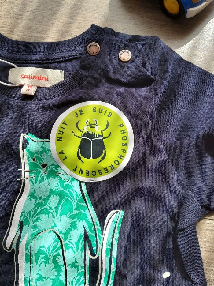 Tee-shirt manches courtes neuf avec étiquette catimini 12 mois, bleu nuit avec dessin chat et hérisson "jeune pousse" phosphorescent. Malheureusement resté au fond du placard. Très beau, deux pressions sur l'épaule.
