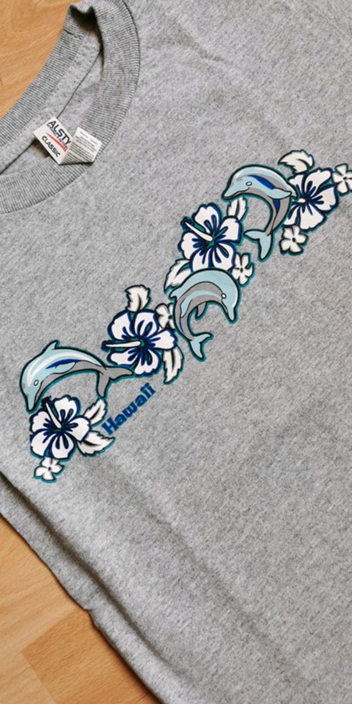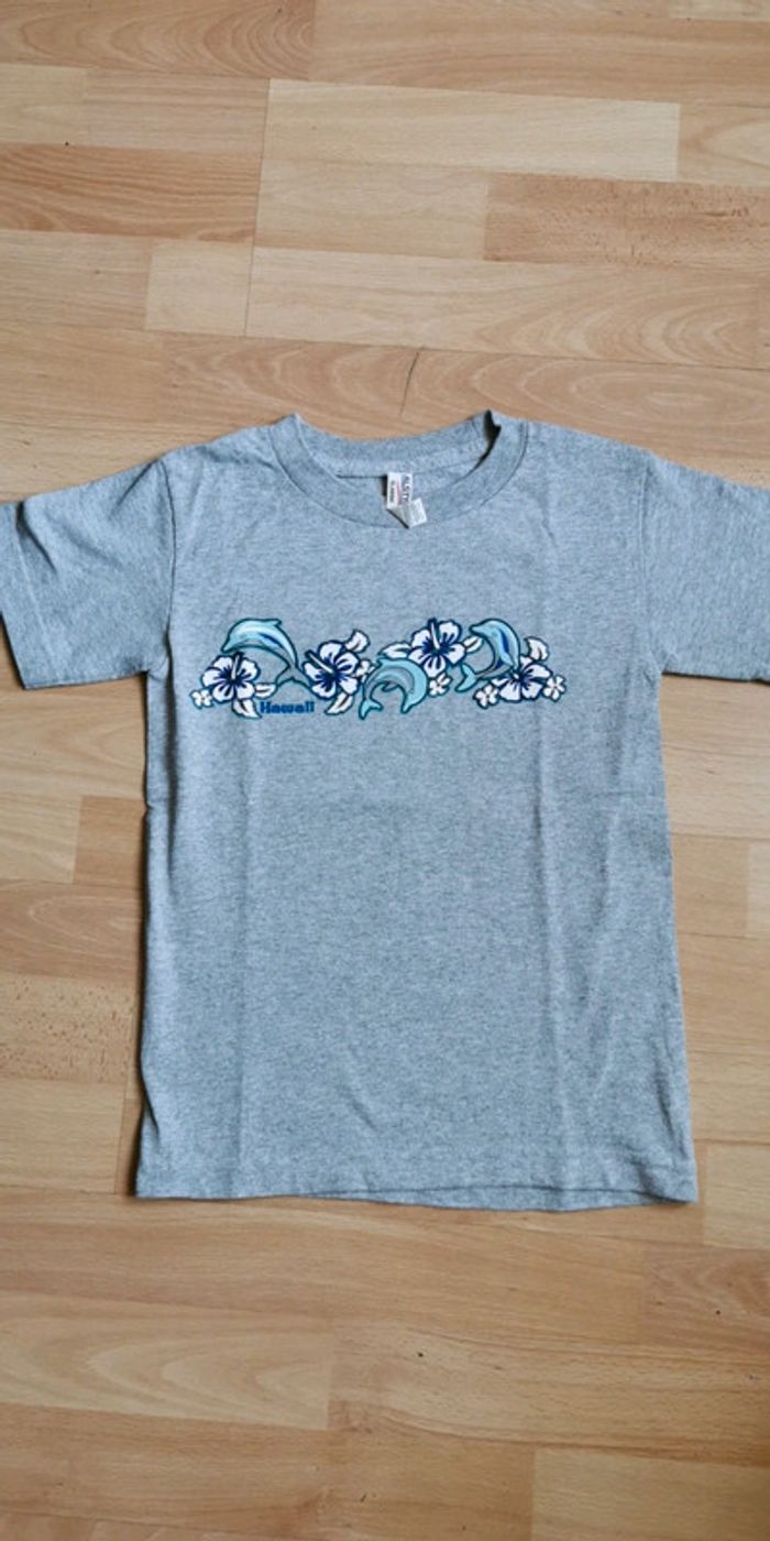 T-shirt gris qui vient d'Hawaï avec un motif dauphin 🐬 taille 8 ans bon état 1 € (dy55) #dydy1510taille8ansg