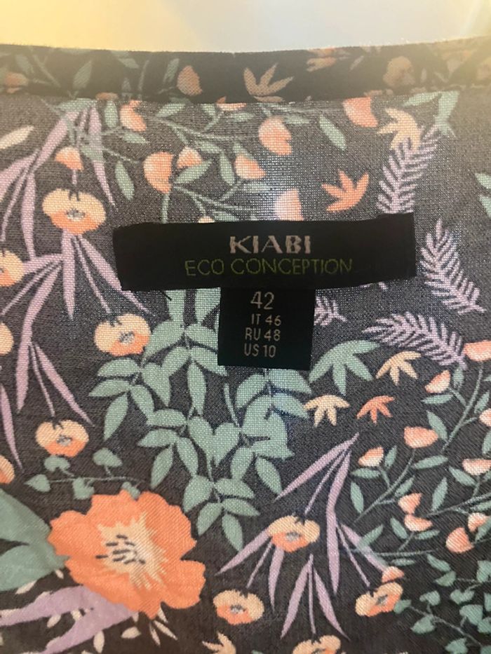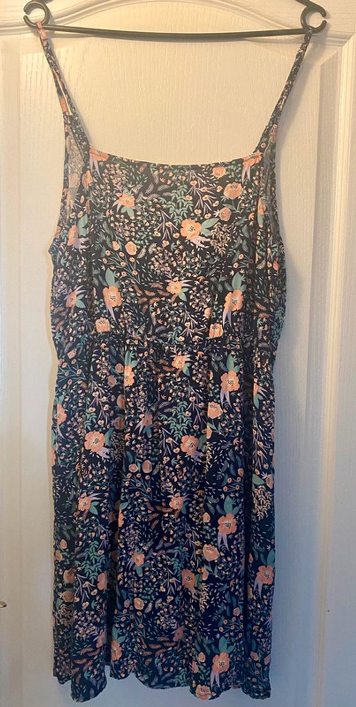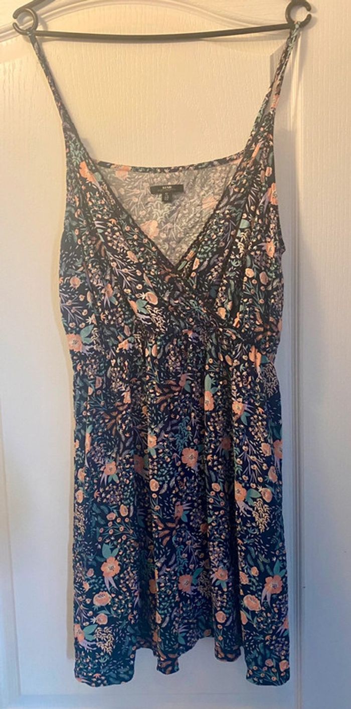 Robe fleurie à bretelle fine réglable, élastique à la taille couleur bleu marine et fleuri Marque Kiabi taille 42 jamais portée