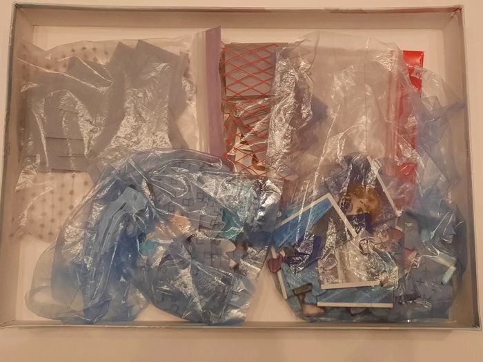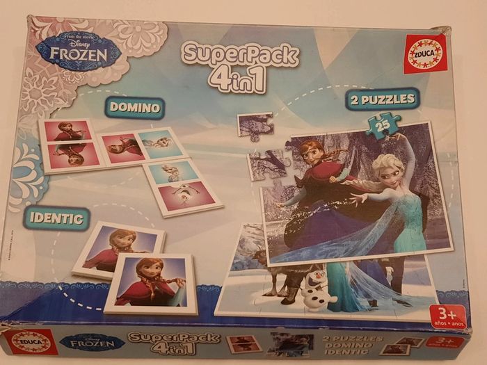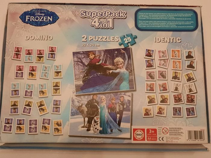 Jeu complet, 2 angles de la boîte abimés et scotchés 2 jeux éducatifs basiques et 2 puzzles aux couleurs de la reine des neiges II Contient : 2 puzzles de 25 pièces, 1 jeu de Memo, 1 jeu de domino Dès 3 ans.