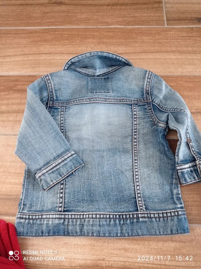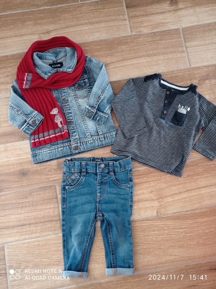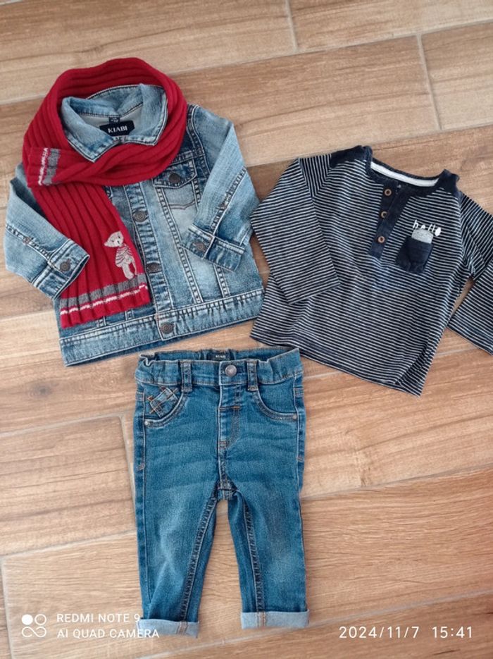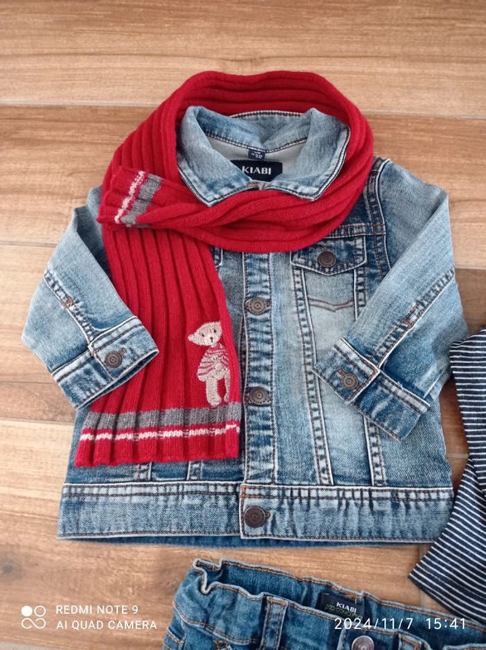 Ensemble 12 mois Jean slim Kiabi Tee shirt a rayures marine Kiabi Veste jean Kiabi Écharpe rouge ourson look rétro