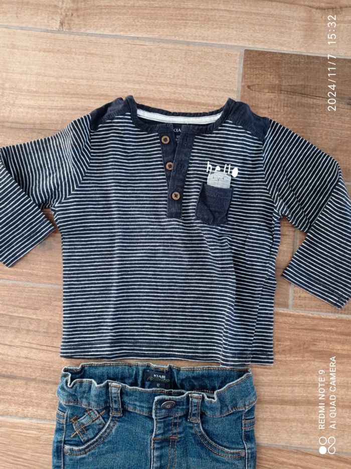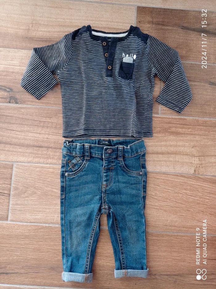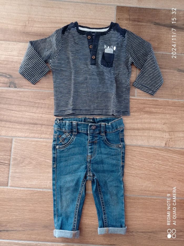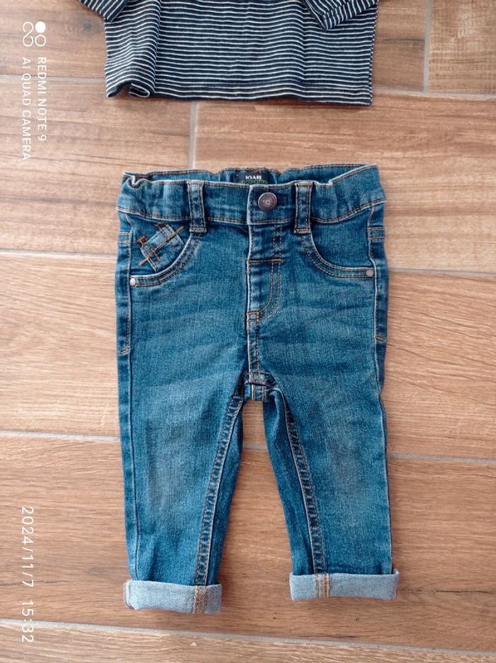 Ensemble 12 mois, jean slim+ tee shirt rayures marine+ veste jean+ écharpe ourson - photo numéro 1