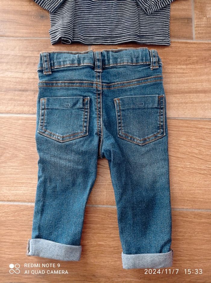 Ensemble 12 mois, jean slim+ tee shirt rayures marine+ veste jean+ écharpe ourson