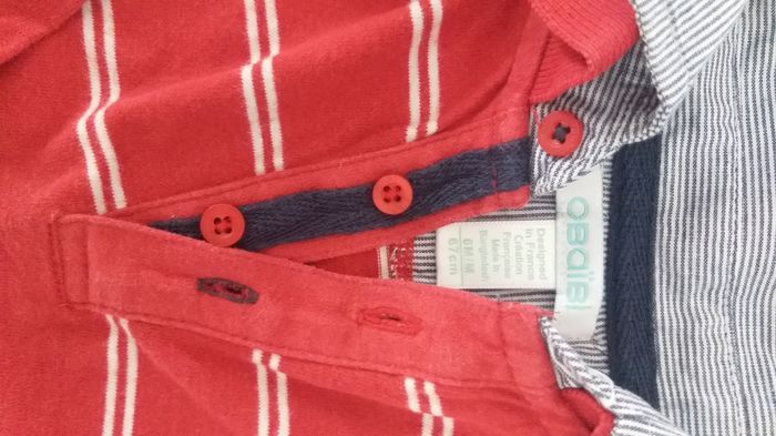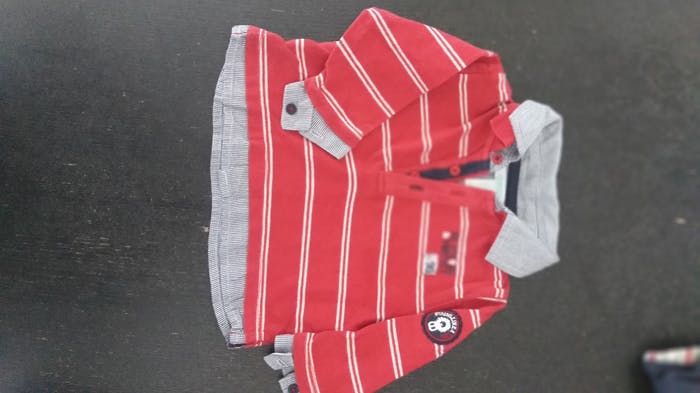 Polo pull garçon manches longues effet chemise. En bon état taille 6 mois de chez Obaibi. Le rouge est plus bordeau mais je n'arrive pas l'obtenir en photo.