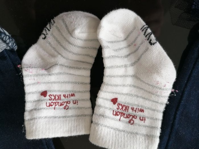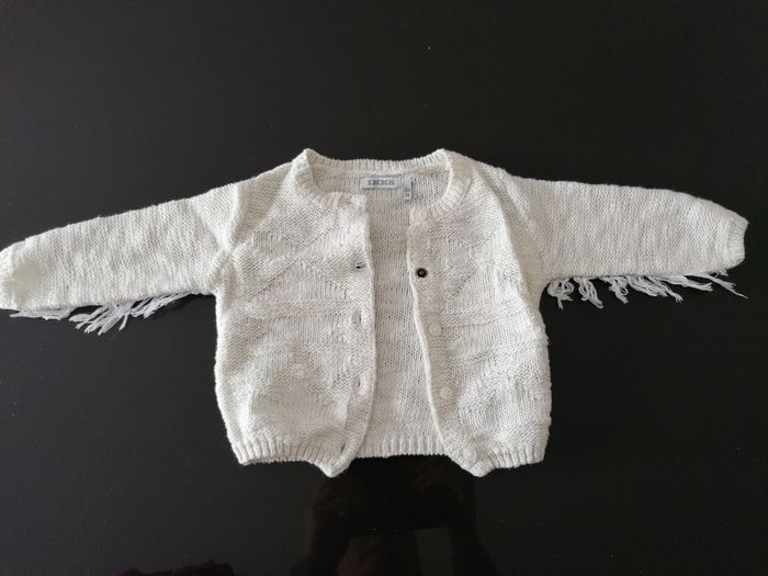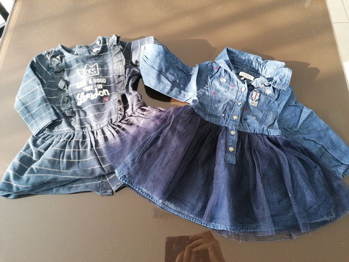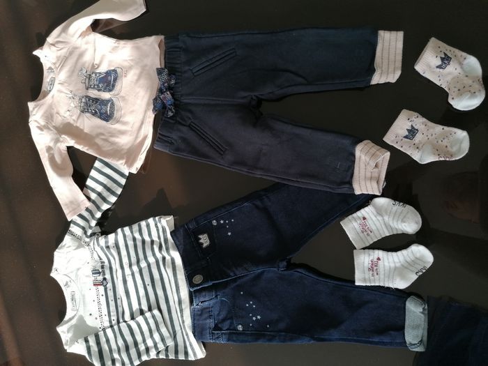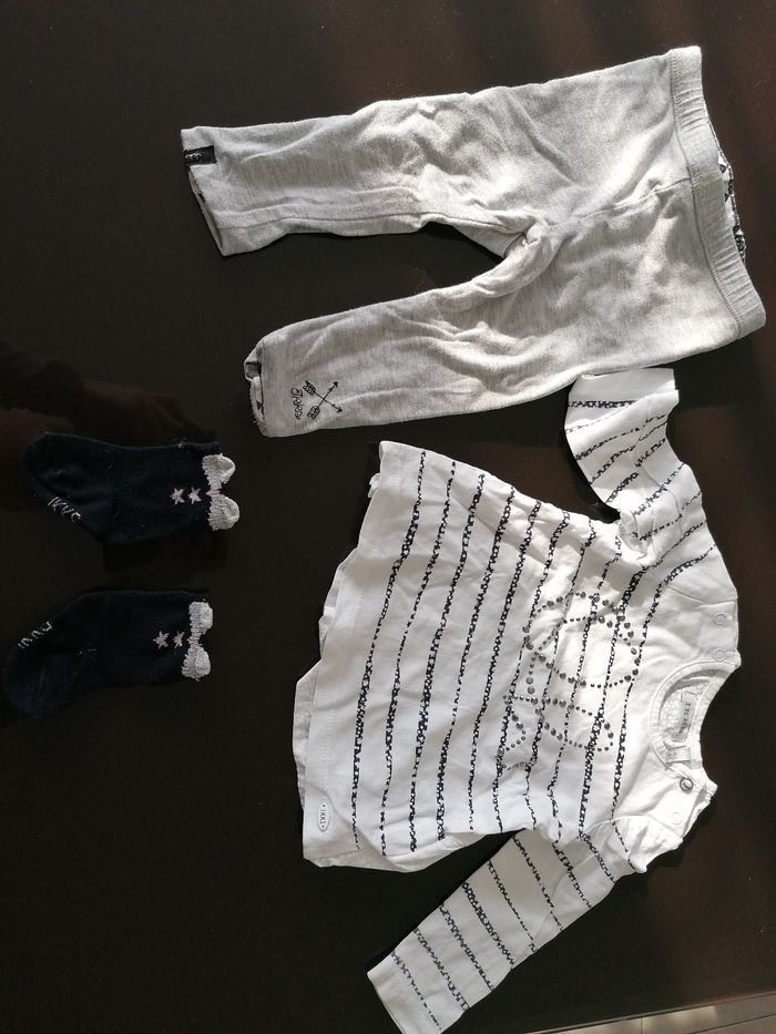 Lot vêtements fille 2 robes, 1 gilet, 2 pantalons, 1 legging, 3 hauts et 3 paires de chaussettes. Taille 6 mois. Très bon état.