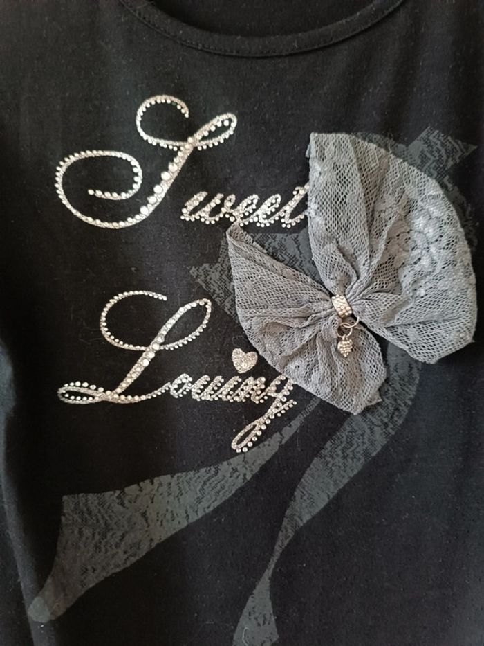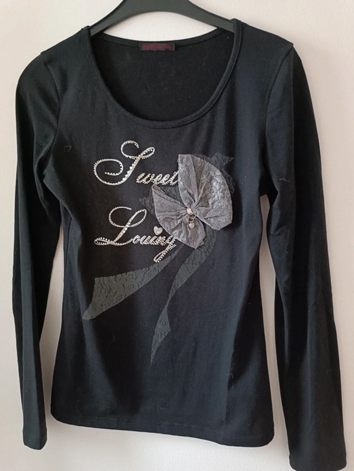 T-shirt manches longues noir avec détails en gris. Beau noeud en dentelle avec strass Taille unique Neuf #clau_d1a_hiver #clau_d1a_pull 📨 Envoi rapide et en petit format ⛔ Je n'accepte pas les retours, échanges ou remboursements. Merci de revendre l'article si celui-ci ne vous plaît/convient pas