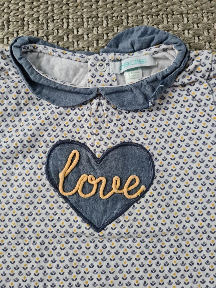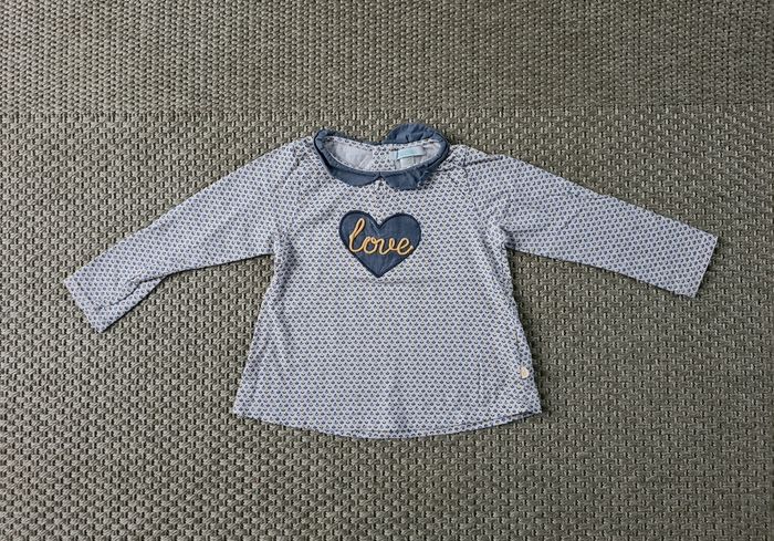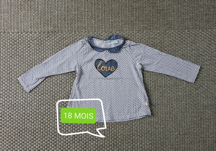 Tshirt à col et manches longues en très bon état. Motif coeur "love". Défaut sous le col voir photos. Taille 18 mois - 80cm - marque okaïdi Envoi Rapide et Soigné. J'applique une réduction si vous prenez plusieurs articles de mon dressing