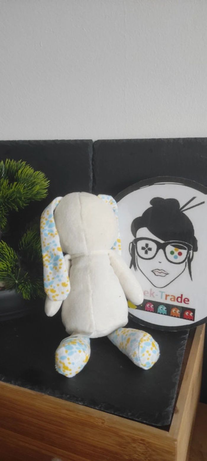 doudou peluche lapin klorane blanc jaune bleu pois fleur gris - photo numéro 1