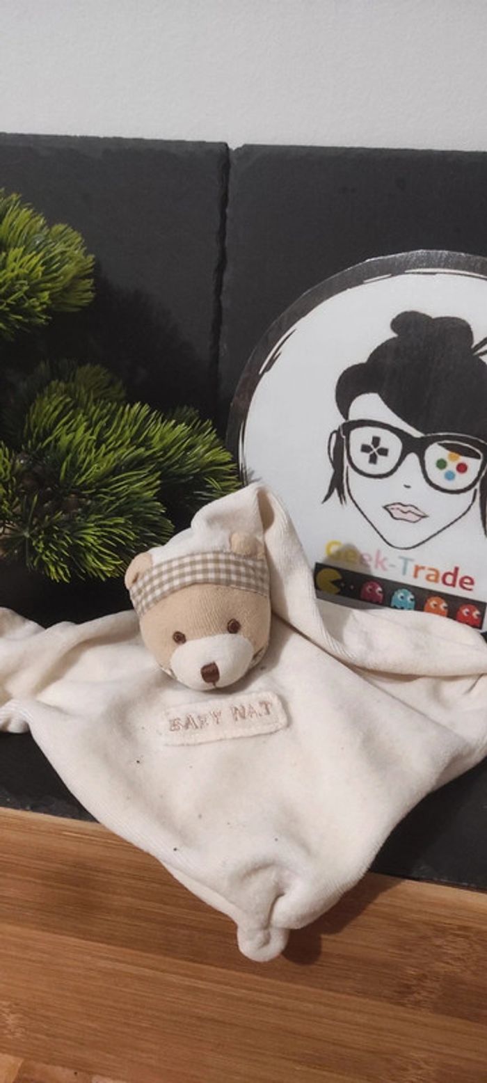 Doudou plat ours blanc vichy beige baby nat bonnet nuit ancien vintage carré carreaux - photo numéro 1