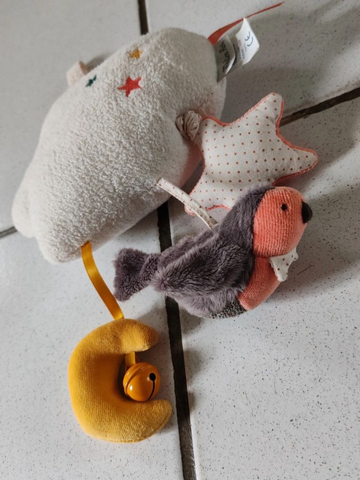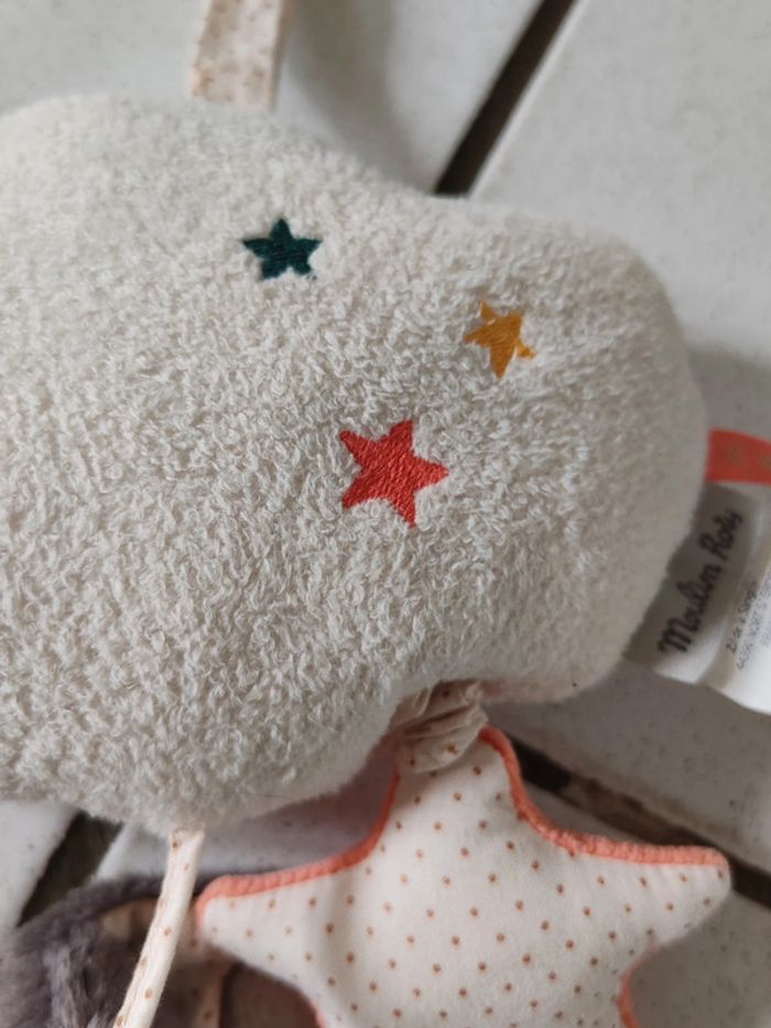 Boîte à musique nuage A suspendre Collection Il était une fois de la marque Moulin Roty Pour jouer ou décorer, à suspendre partout, ce nuage d’activités en fourrure toute douce accompagne bébé tout au long de la journée : une lune grelot et un oiseau pouët pour s’amuser, ou une étoile à tirer pour s’endormir sur une douce mélodie. Très bon état ➡️ #ursullabuffaymoulinroty #ursullabuffaypeluches #ursullabuffaybébé
