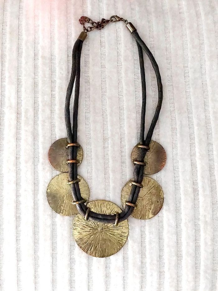 Magnifique collier cordelette avec plastron doré. Bon état général, petit signe d'usures. D'autres bijoux sont à découvrir dans mon dressing #bijouxsupernova 💙 Nous offrons 10% de réduction pour nos abonnés Instagram @caelifer_ ⚜️ Je suis disponible pour d'autres renseignements / ou demandes de lot. 💙 Les envois se font soit le jour même ou en 72h maxi ! Tags Vintage chic hippie 60's 70's 80's 90's 00's Y2k foulard soie collier bijoux fantaisie signature boucles d'oreilles bague bracelet manchette jonc parure pendentif médaille religieux ancien brocante antiguo antico juwelen bigiotteria joyería antigua antique antik vieux victorien belle époque 1920 art déco art nouveau 1930 années 50 lot gros lot lotto set carré friperie poinçon pièce rare argenté doré bronze perles strass