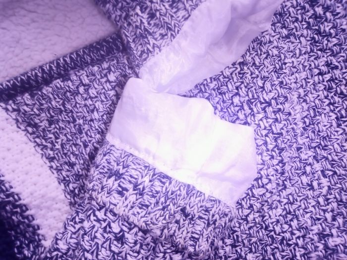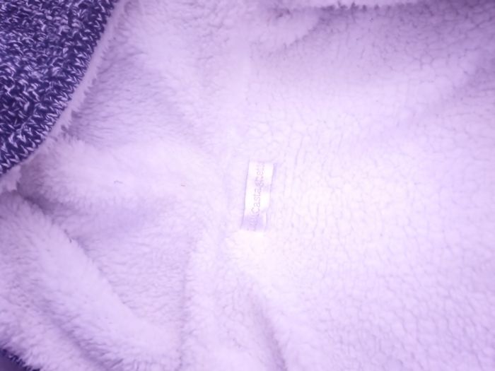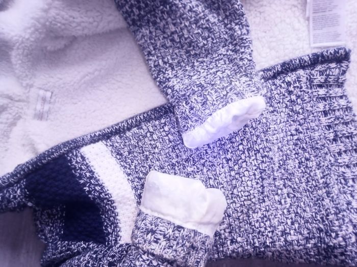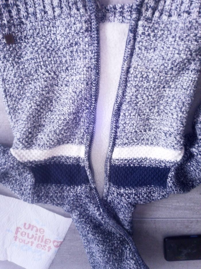 De légère tâche au niveau des manches je n'arrive pas trop à les faire ressortir au niveau des photos et un petit peu d'usure au niveau des manches il n'y a plus l'étiquette de taille mais c'est du 3 ans