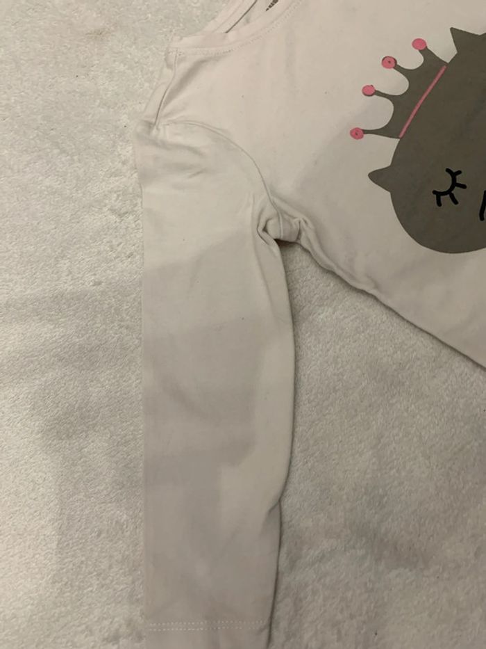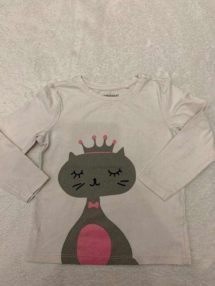 Tee-shirt de la marque orchestra taille 3ans composé à 95% coton et 5%elasthanne Présence de taches à divers endroits et le blanc a ternis #orchestra #chat #3ans #3years #3años