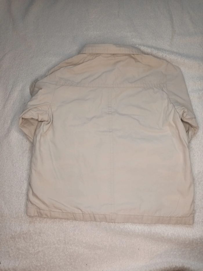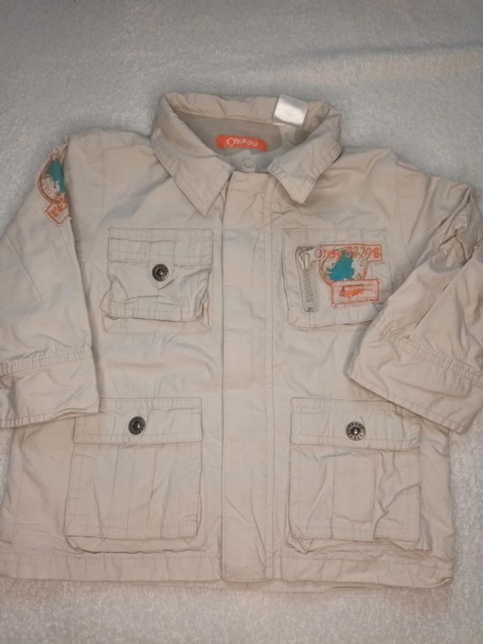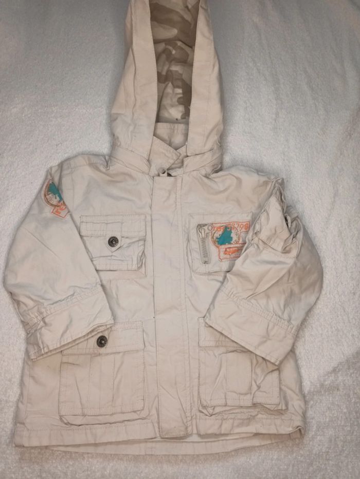 Manteau mi saison de la marque okaou taille 9 mois composé à 100%de coton avec capuche amovible