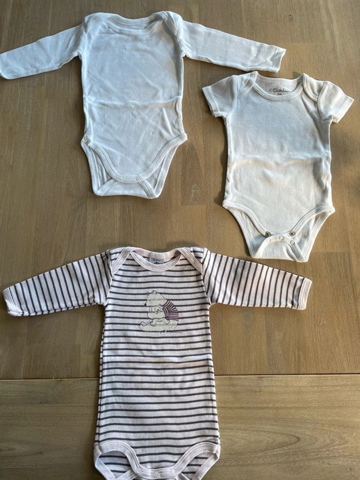 3 bodies dont 1 Petit Bateau, 1 Kitchoun et l’autre je ne sais pas la marque taille 3 mois