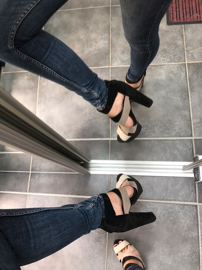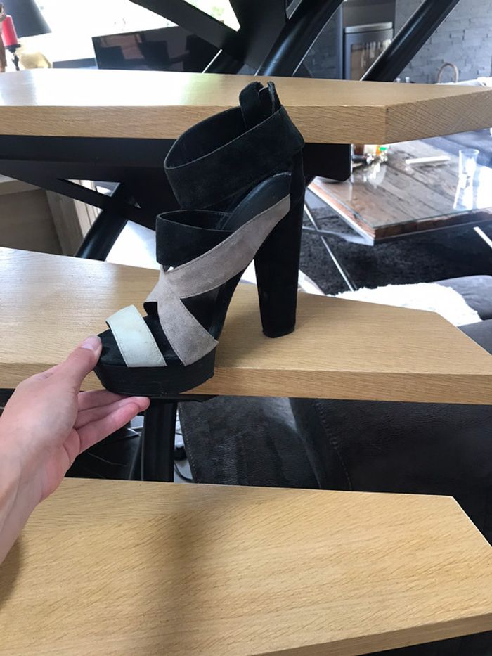 Sandales en cuir Marque ALQ Alain Quilici. Achetée sur le site 3 suisses Talon 13 cm avec une plateforme de 3 cm Achetées 110€ Un peu abîmé au niveau de la semelle et qqes traces sur le daim ce photo