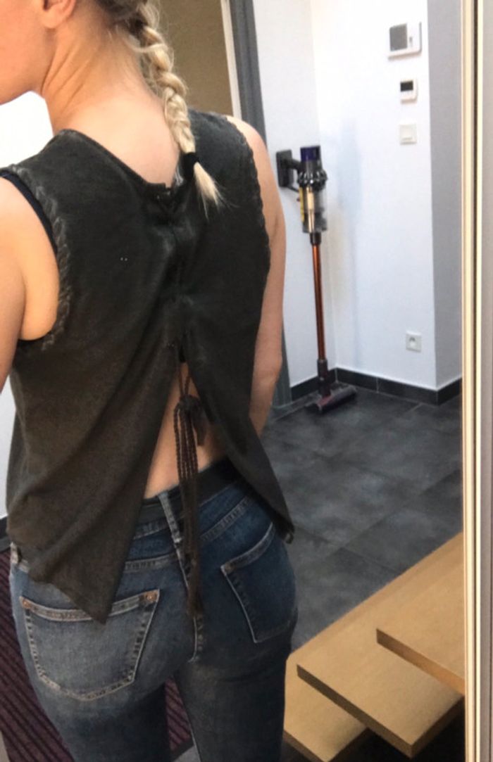 haut mango porté une fois ouvert dans le dos peut convenir aussi à un S