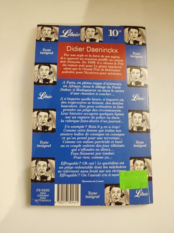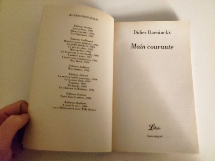 Livre / roman noir ( nouvelles) Main courante de Daeninckx Edition verdier 1994 / modèle Librio texte integrale Histoire : Des attentats parisiens à Madagascar, dans le sillage du Paris-Dakar ou dans le secret d'une chambre à coucher, à n'importe quelle heure, n'importe où, des trajectoires se brisent, des destins basculent. Des gens ordinaires se font prendre au piège des circonstances...Un exemple ? Cette femme qui traîne son sinistre ballot de consigne en consigne et qu'on prend pour une terroriste... Cet enfant parricide et buté ou ce couple vedette des jeux télévisés qui s'effondre en direct... Le quotidien est un piège redoutable dont les mâchoires se referment sans bruit sur ses victime,. Effroyable ? On l'aurait cru à moins... Didier Daeninckx Consacré en 1985 pour Le Géant inachevé et Meurtres en mémoire par le Prix du roman noir et le Grand Prix de littérature policière française. Parfait etat ! Petites imperfections taches blanches sur tranche Dimension : 13 x 20,5 cm Illustration de Loustal.