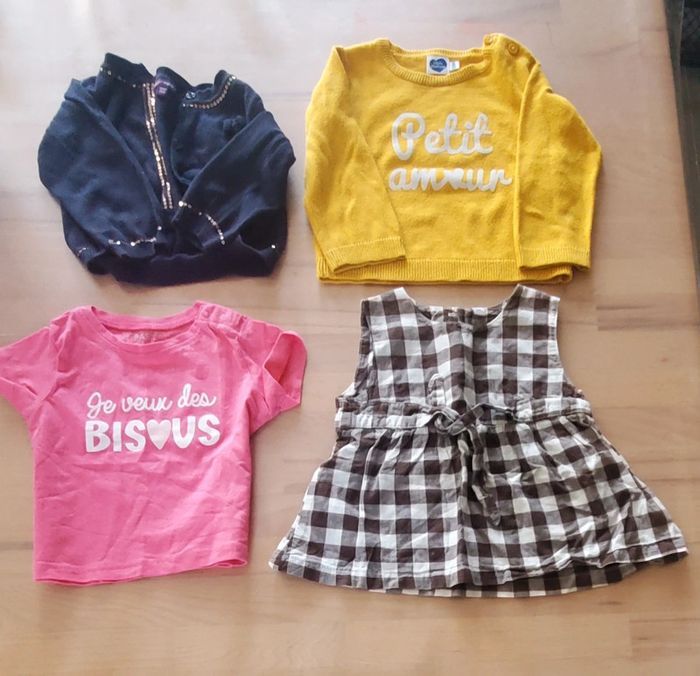 Achat individuel possible, prix devant chaque article demander en mp pour diviser le lot 1. Gilet bleu marine manche longue marque Sergent Major 2€ 2. Pull jaune marque mots d'enfants 1.50€ 3. T shirt rose marque Fpc 1.50€ 4. T shirt a carreaux manche courte 1.50€ Taille 1 ans #tif5061fille1ans #tif5061gemo #tif5061lot Bonjour...🤗 ✔ Envoy UNIQUEMENT par mondial relais et relais colis ✔ départ du colis dès le lendemain. ✔ petite surprise dans le colis..😉 ✔ plus de photo et renseignement sur demande. 📵mes attentions aucune photo portée📵 🚫 pas de réservation, pas de retour, pas d'échange, pas de remboursement. Merci de votre compréhension..😍🤗😁