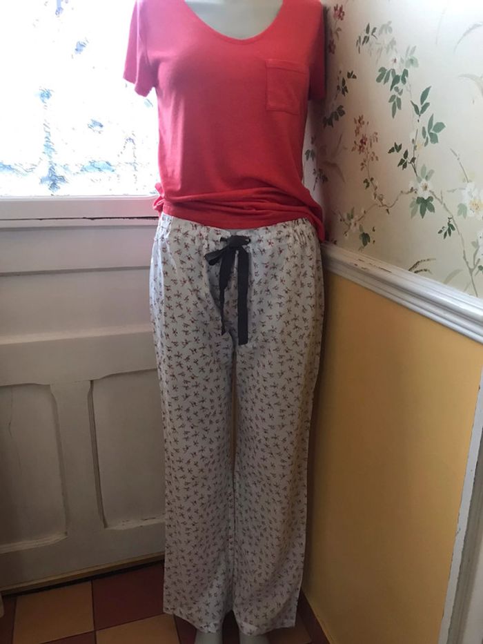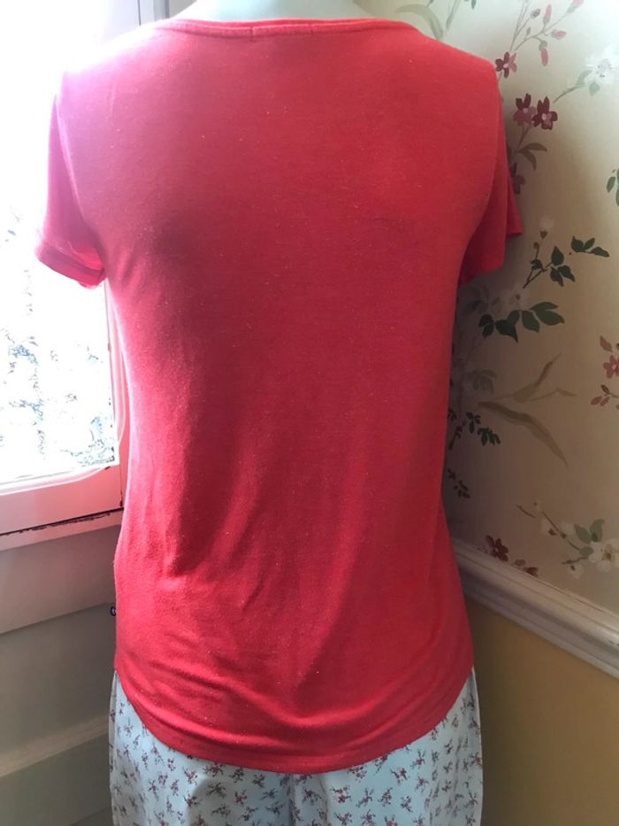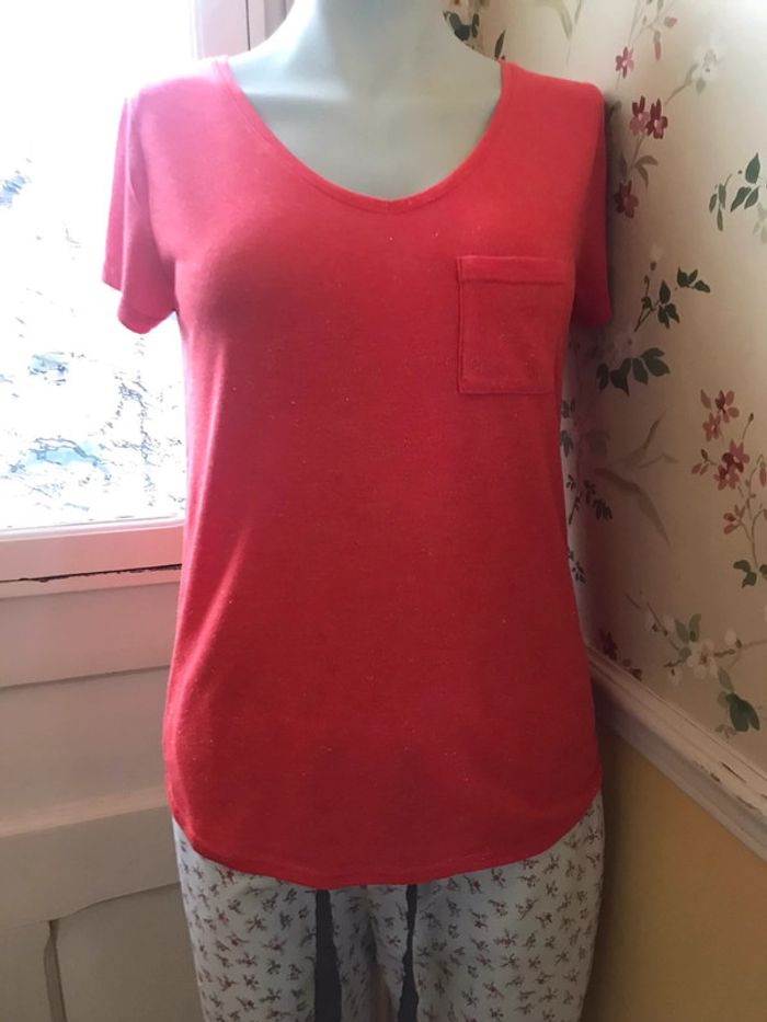 Bonjour je vous propose ce joli T shirt corail/ orange pailleté (fils d’ argent) avec une poche à gauche col en V. Manches courtes Marque Bonobo Taille S Bon état #orange