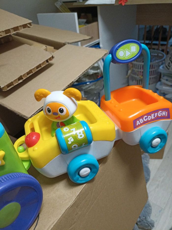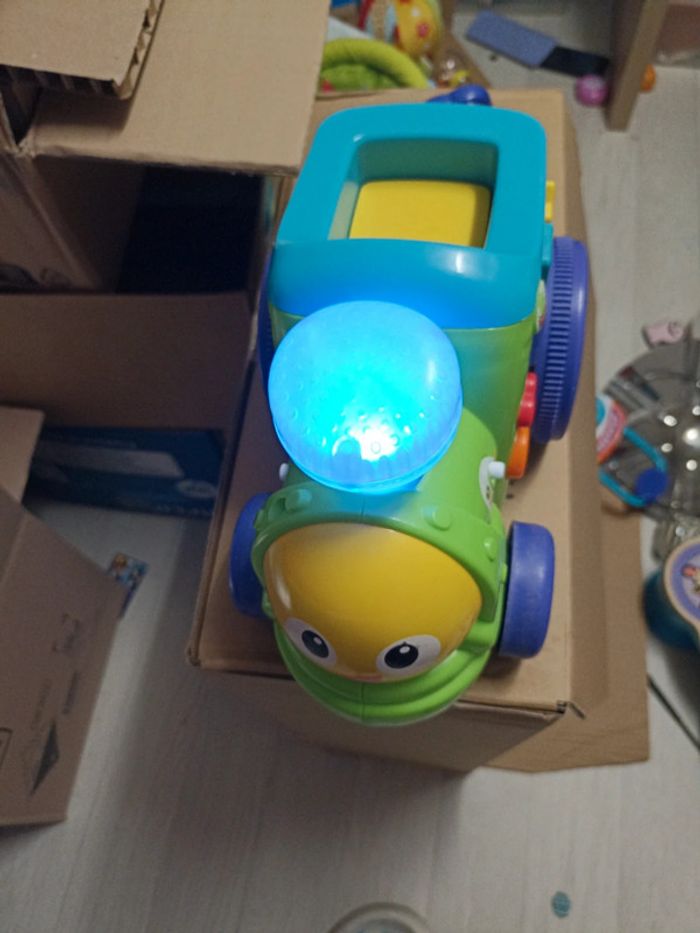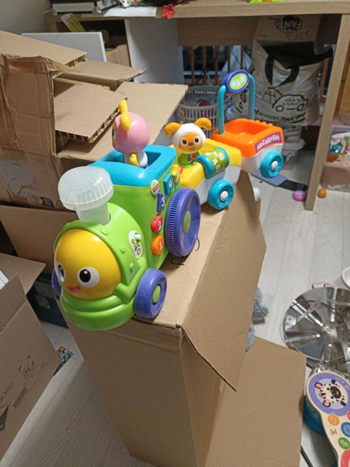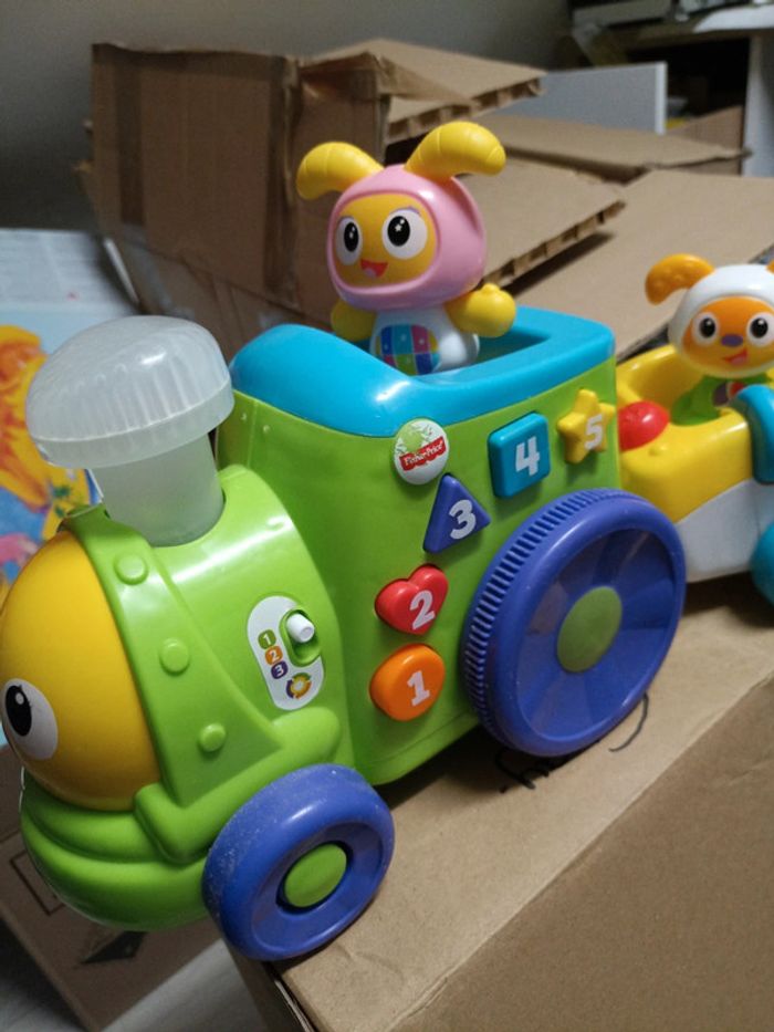 Train Fisher Price avec deux personnages. Le train doit également avancer mais je crois que les piles commencent à fatiguer, du coup pas certaine qu'il avance encore. Sinon fait bien de la musique et couleur. Quelques traces d'usure.