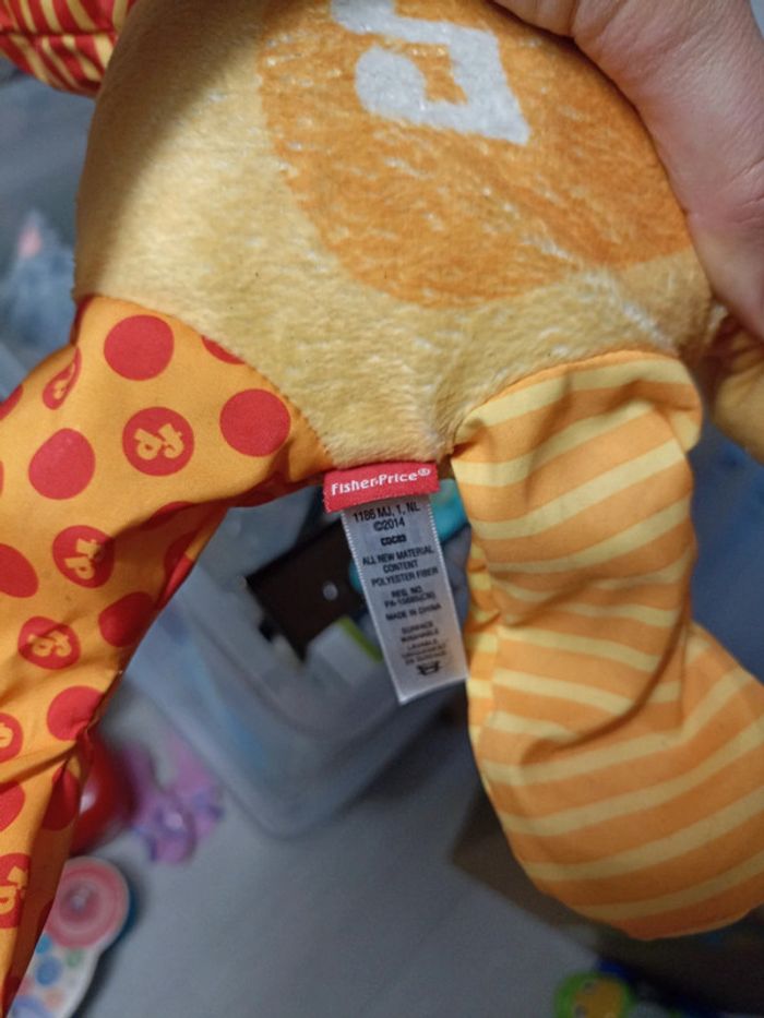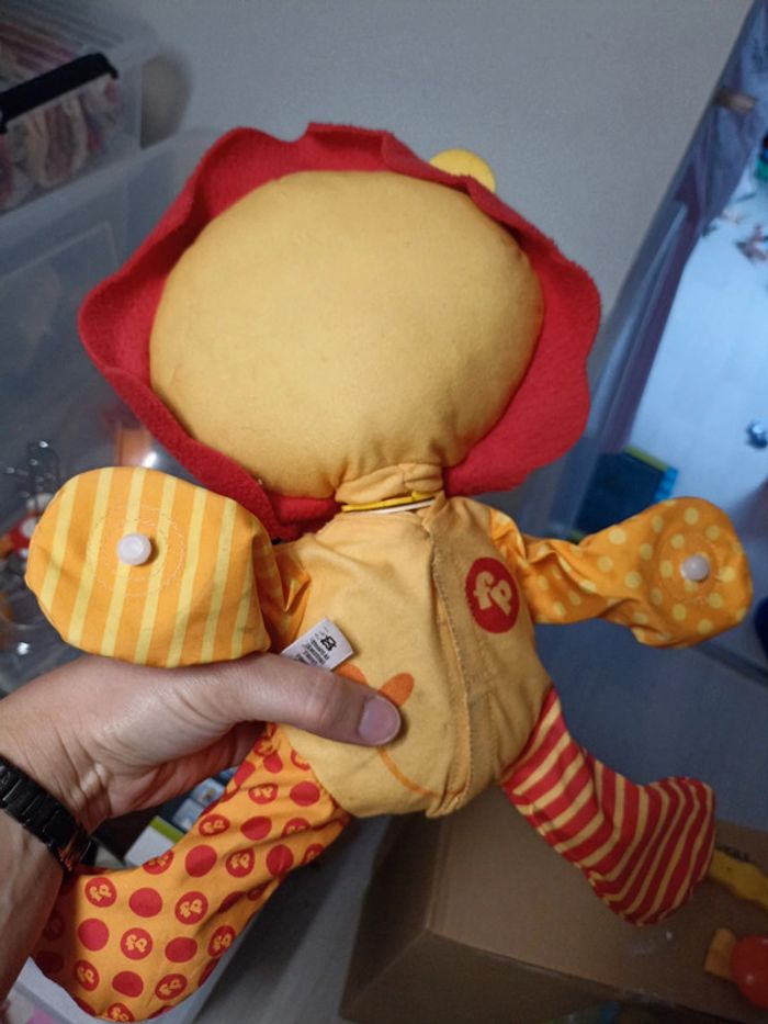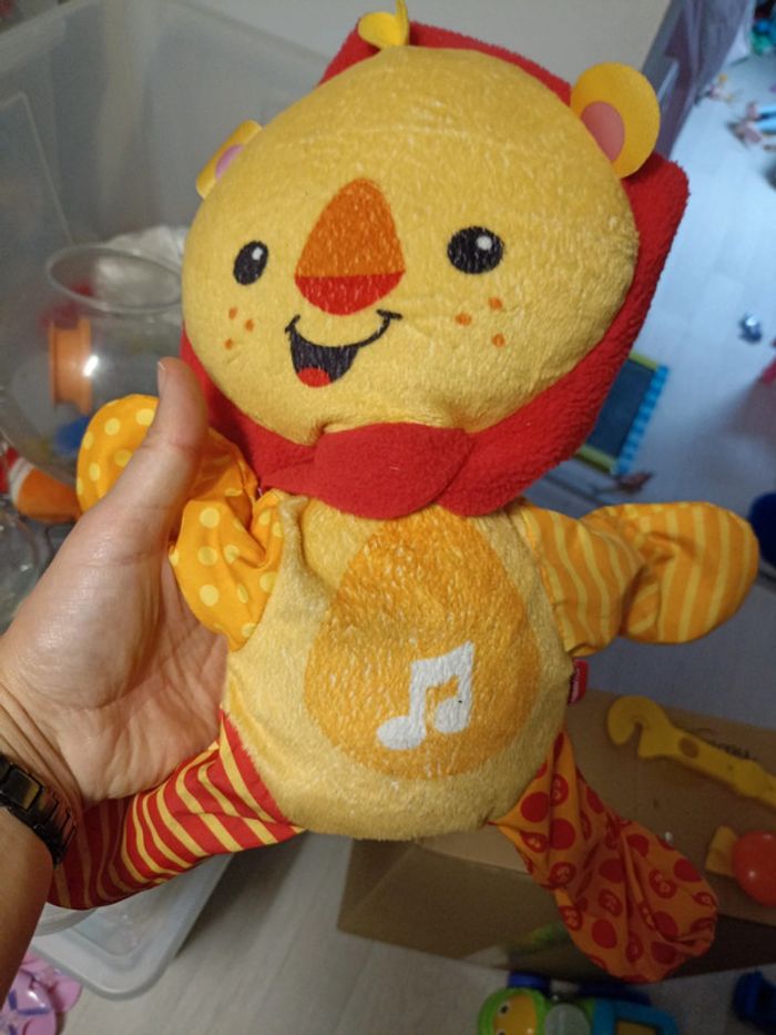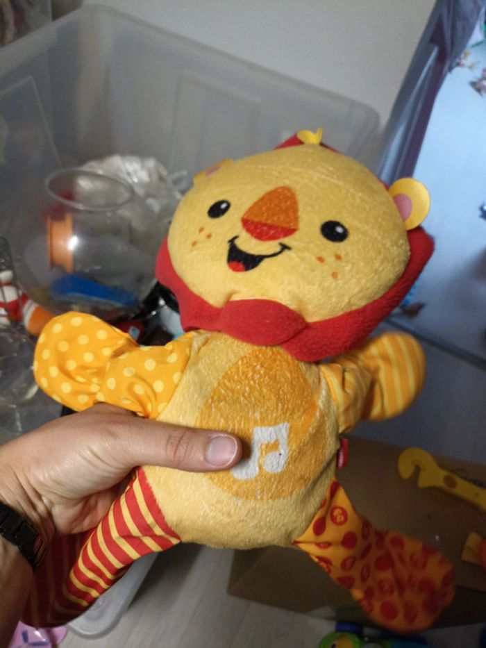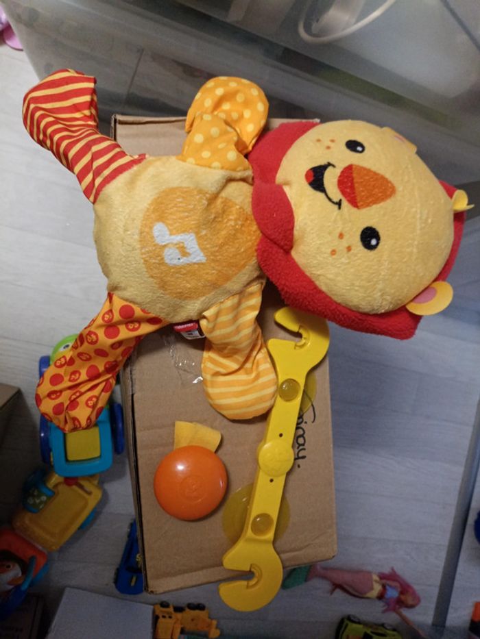 Lion musical avec fixation pour les vitres de la voiture et bracelet grelot . Il bouge également. Bon état, coup de nettoyage à prévoir et piles qui commencent à lâcher