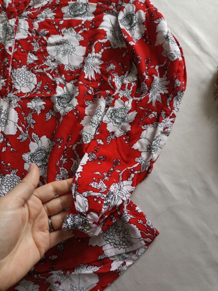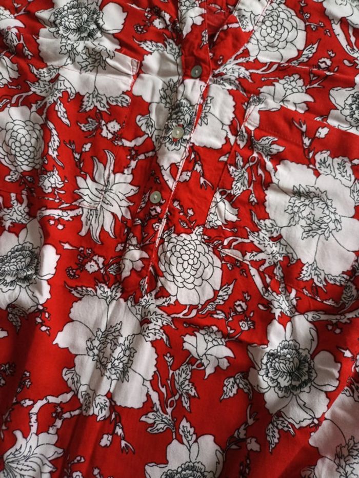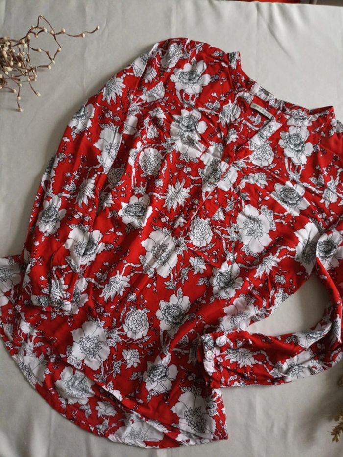 Blouse rouge à fleurs , ligne à suivre, taille 38. Manches retroussables. Poches à la poitrine. #M38marylinebonte