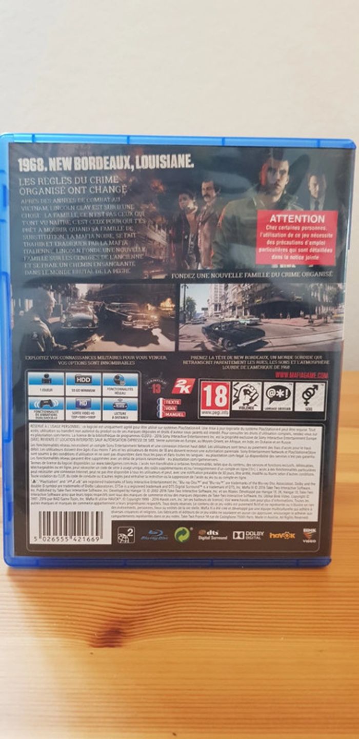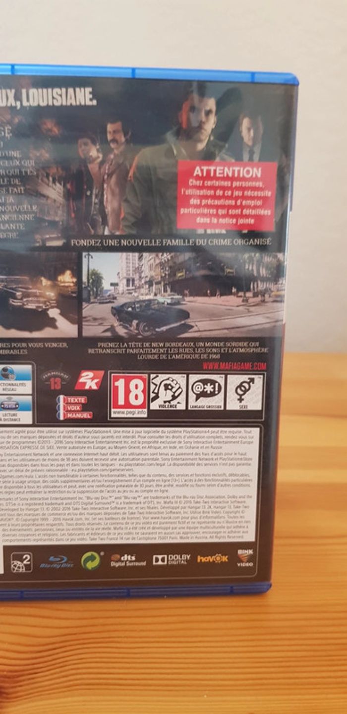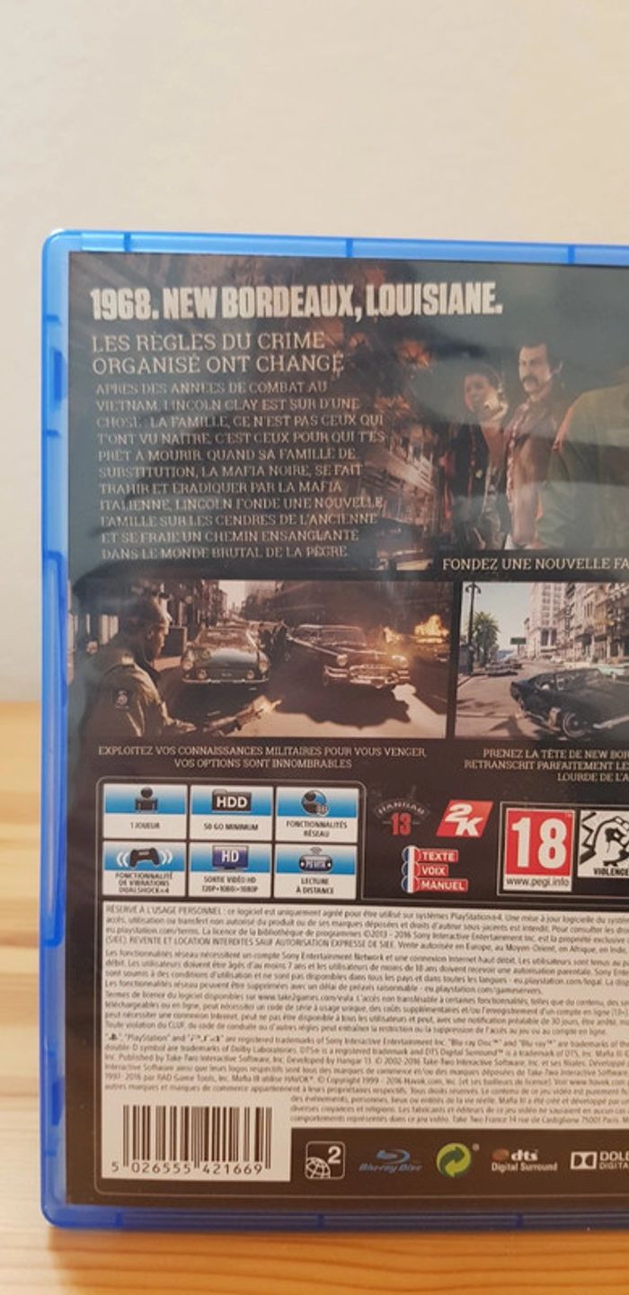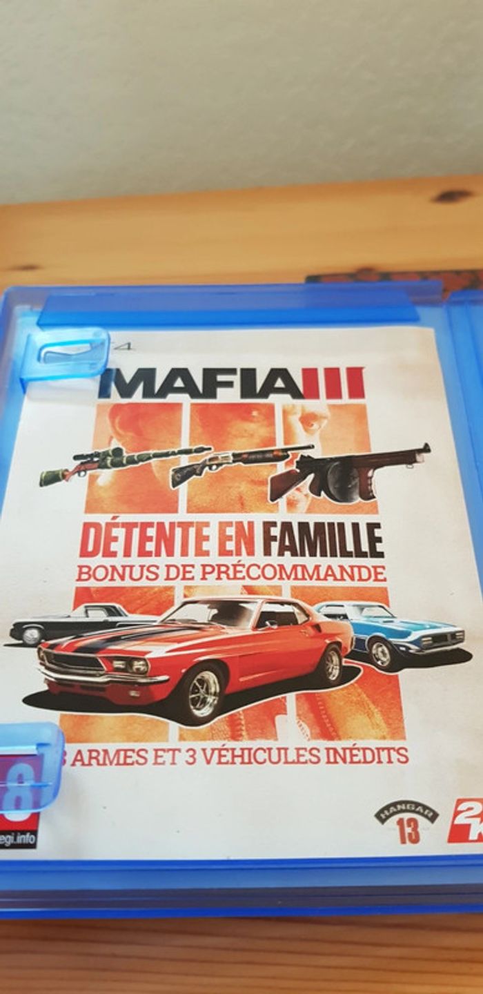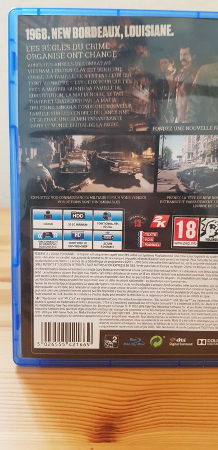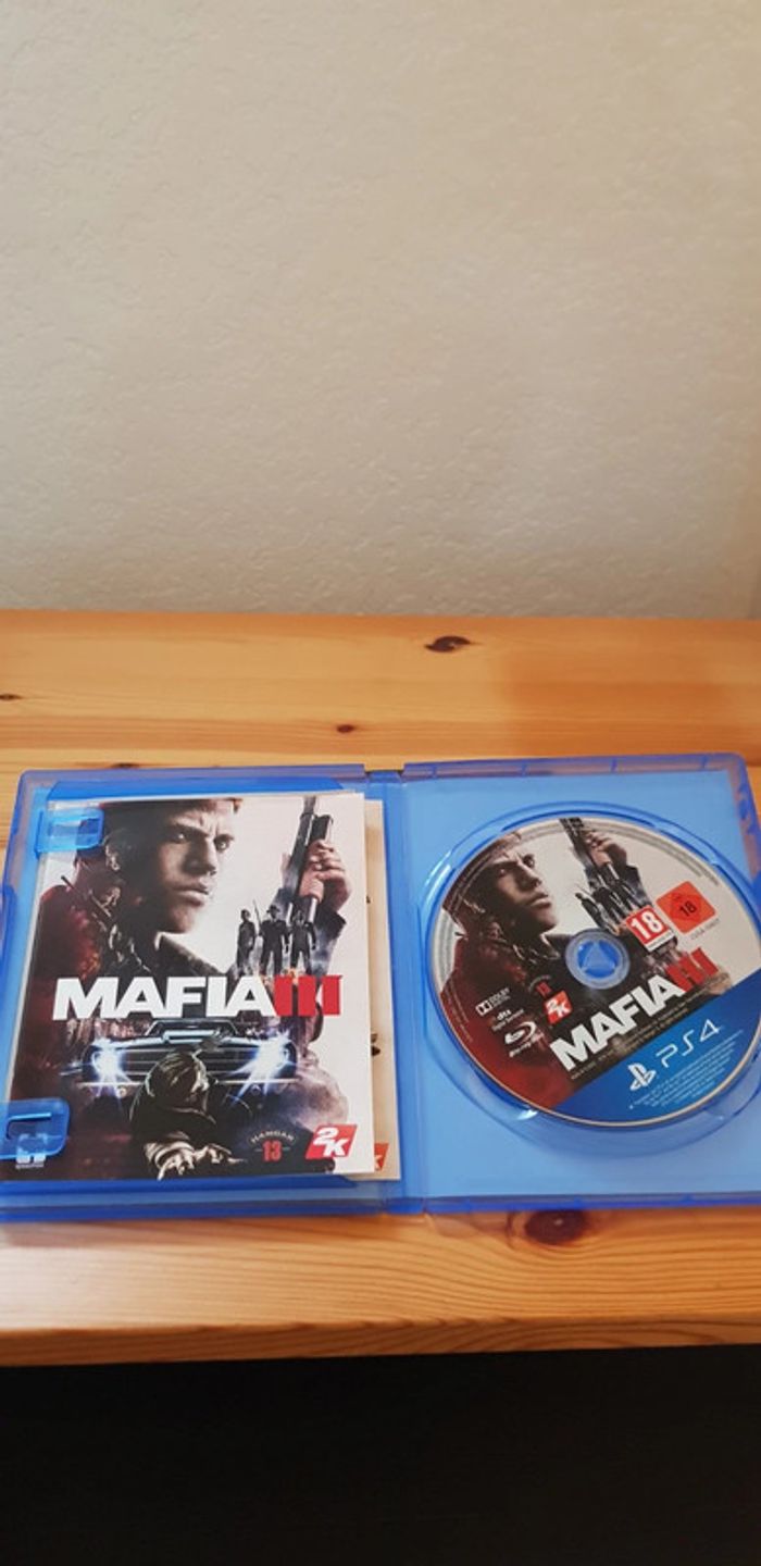 Jeu Mafia 3 pour PS4. Avec livret et map. Bon état général (le cd ne tient plus parfaitement dans le compartiment de la boîte mais cela n'est pas gênant du tout).