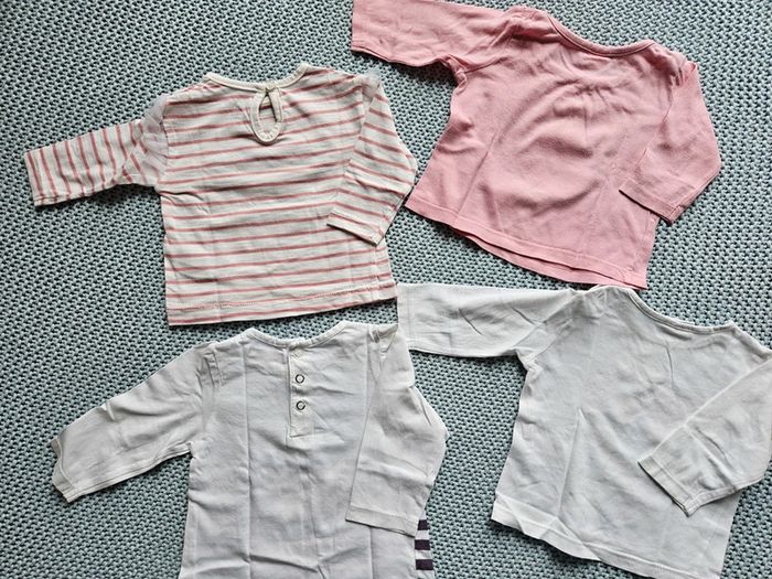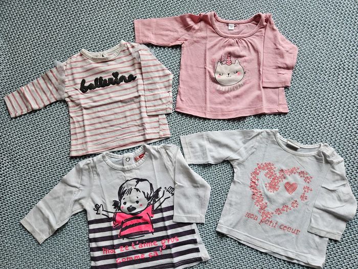 Lot de 4 t shirts manches longues Marque Tex baby: blanc à rayures roses "ballerina" et volants aux épaules Marque ?? : rose " I believe in Kitticorn" Marque DP...am : blanc à rayures violettes dessin de fillette " Ze t'aime gros comme ça"(peinture des pressions écaillée) Marque Kitchoun : blanc motif "Mon petit coeur" Taille 3 mois. #mimidacenfant # mimidacfille3mois