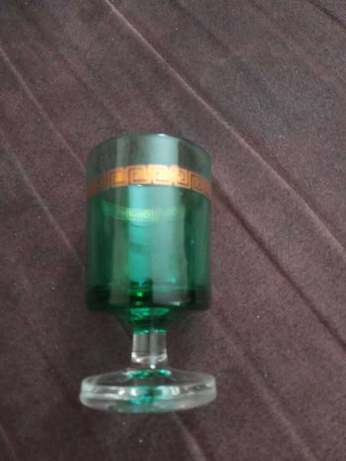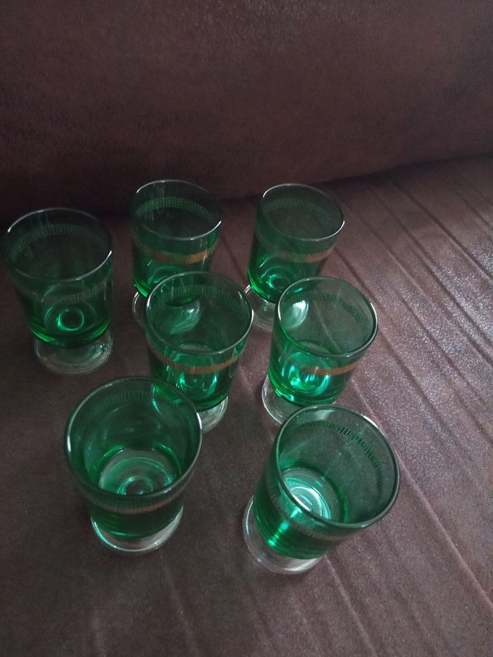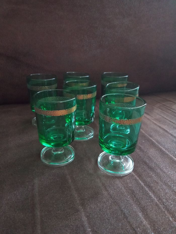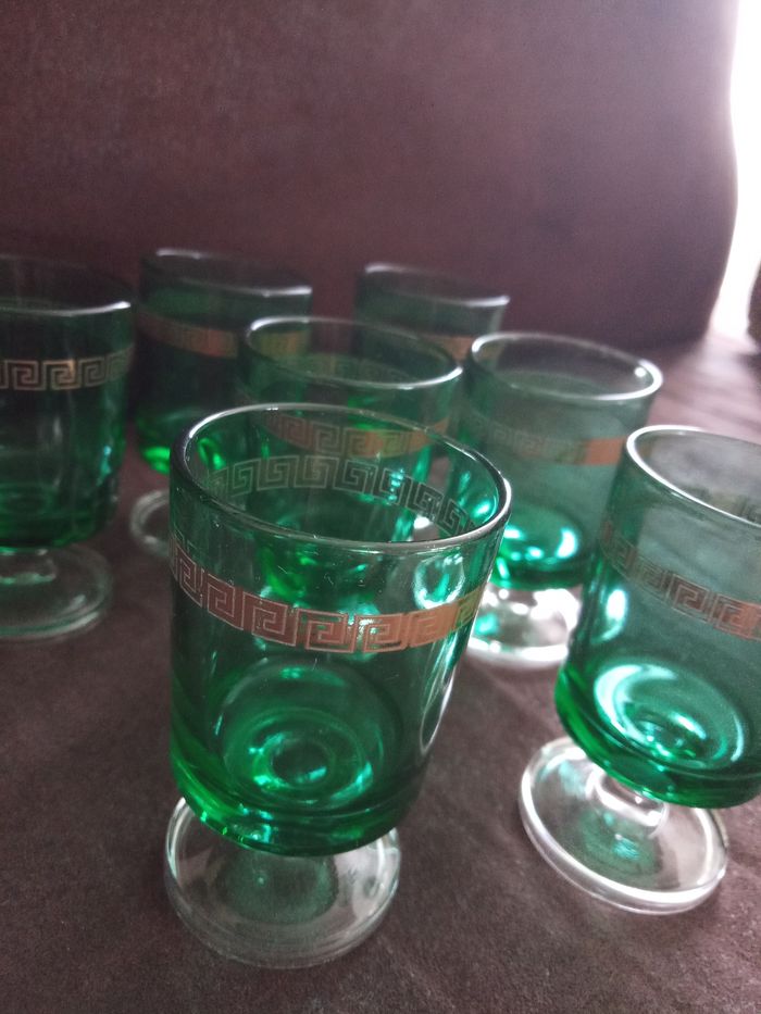 Ensemble de 7 petits Verres à Digestif à pied (élégants) Dimensions: environ Hauteur 7,5cm - Diamètre 4cm Couleur: Vert Transparent avec motifs dorés Petit côté vintage Petits Verres en parfait état (mis à part le doré qui se retire par endroit) vendus comme sur les photos