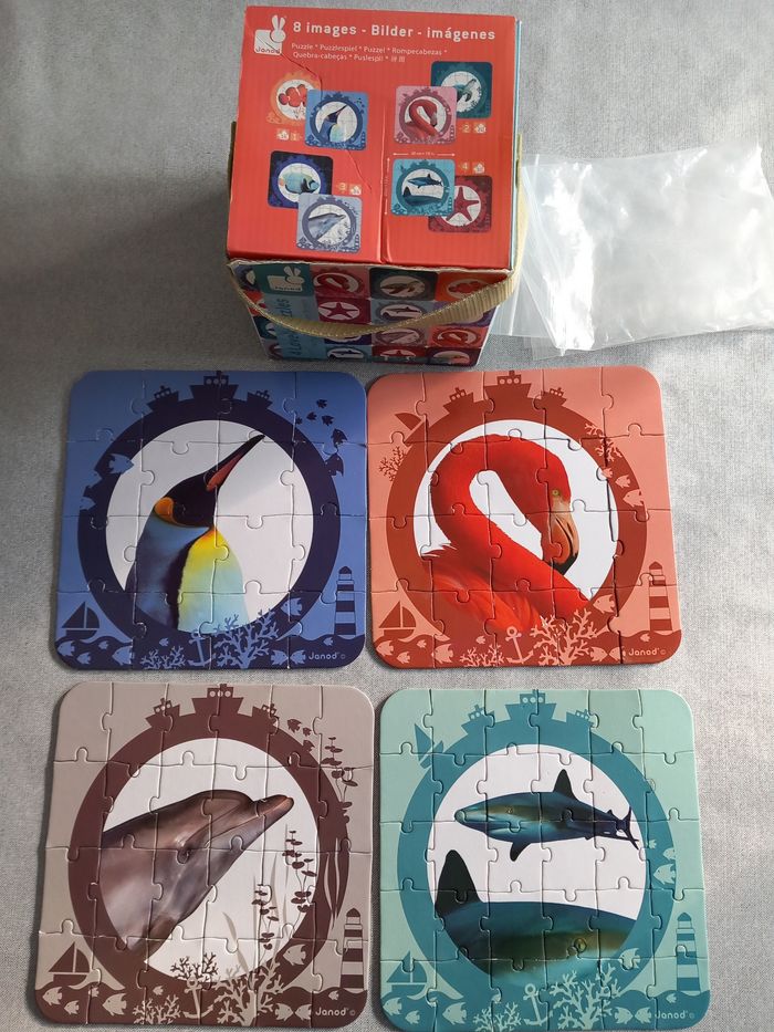 4 puzzles recto verso donc 8 puzzles au total. Thème sur la mer! Marque Janod En très bon état. Quelques pièces sont légèrement abîmées (cf. Photo) 3-7 ans