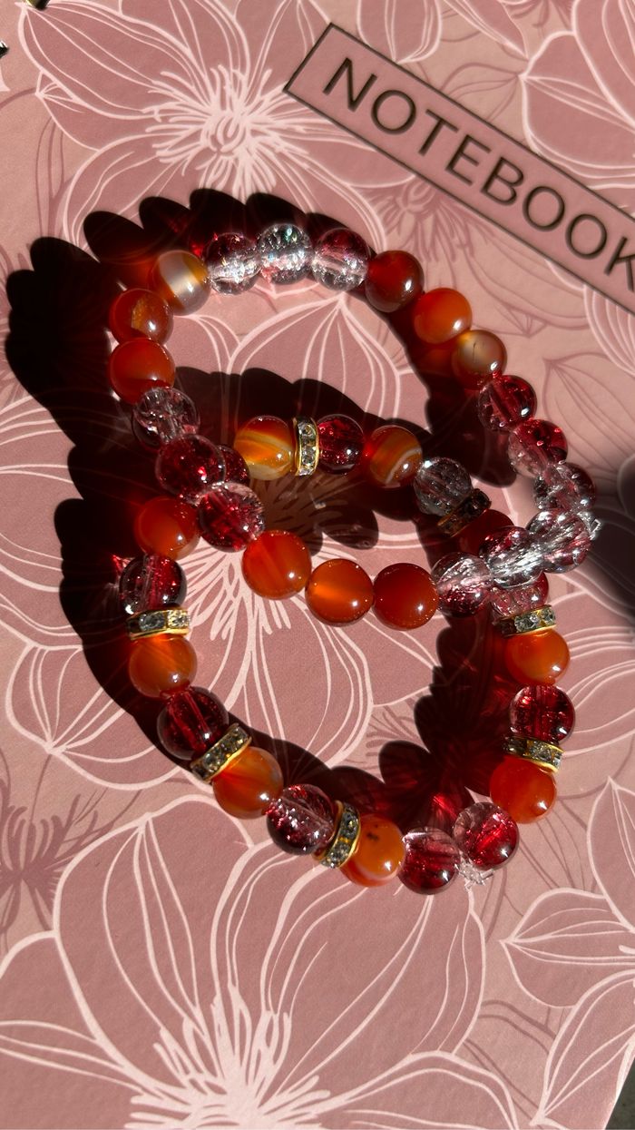 Découvrez ce duo de bracelets aux perles rouges et oranges, rehaussé de petits motifs dorés pour une touche élégante et lumineuse. Ce design unique apporte chaleur et sophistication à votre poignet, parfait pour ajouter une pointe de couleur et de style à votre tenue. Chaque bracelet est confectionné avec soin pour un look chic et intemporel.
