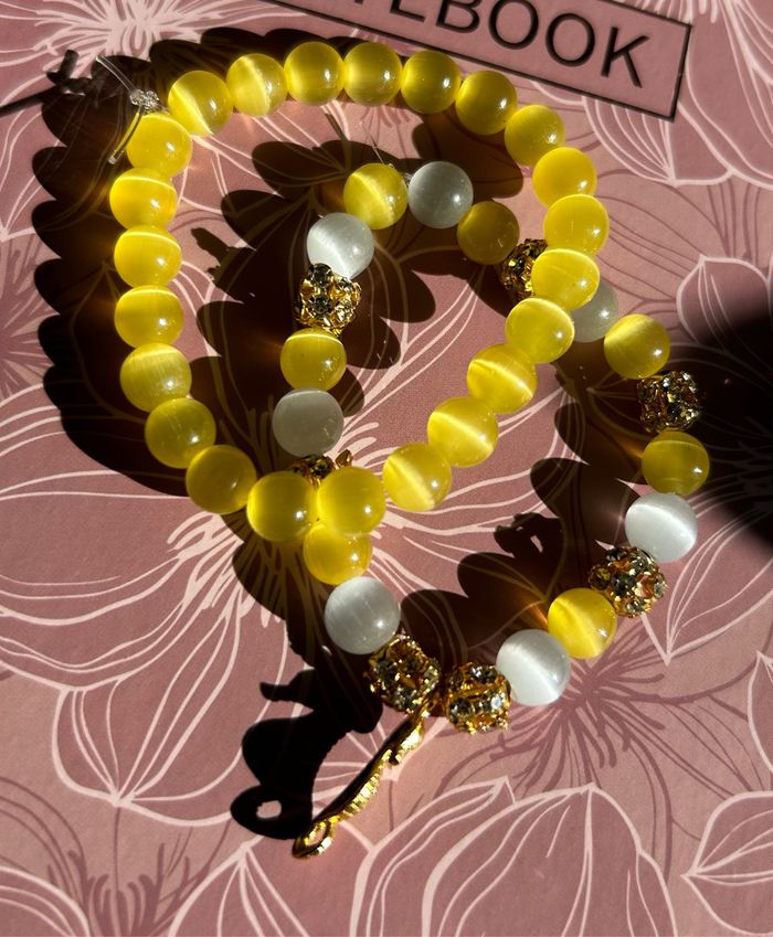 Ajoutez une touche d'éclat et de fantaisie avec ce duo de bracelets en perles jaunes et blanches, ornés de motifs dorés et d'un charmant pendentif hippocampe. Ce design lumineux et unique allie douceur et originalité, parfait pour un style estival ou pour égayer votre tenue. Confectionné avec soin, ce duo apporte une note de fraîcheur et d'élégance à votre poignet.