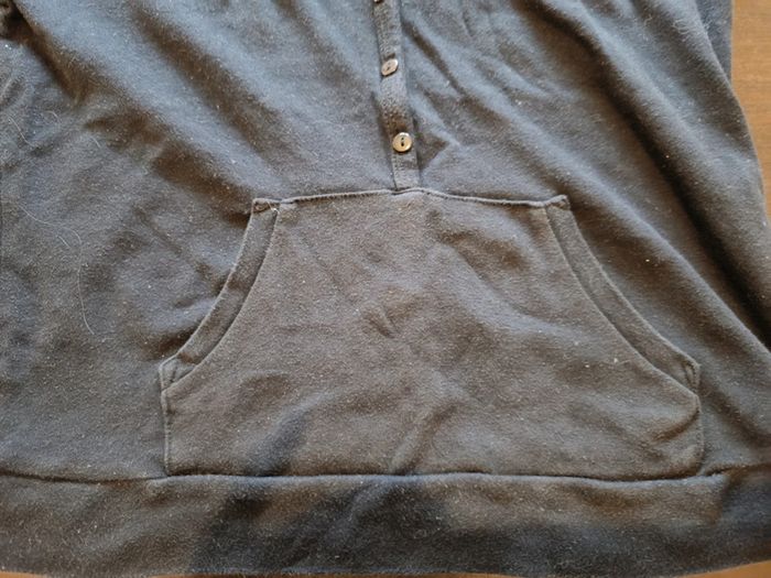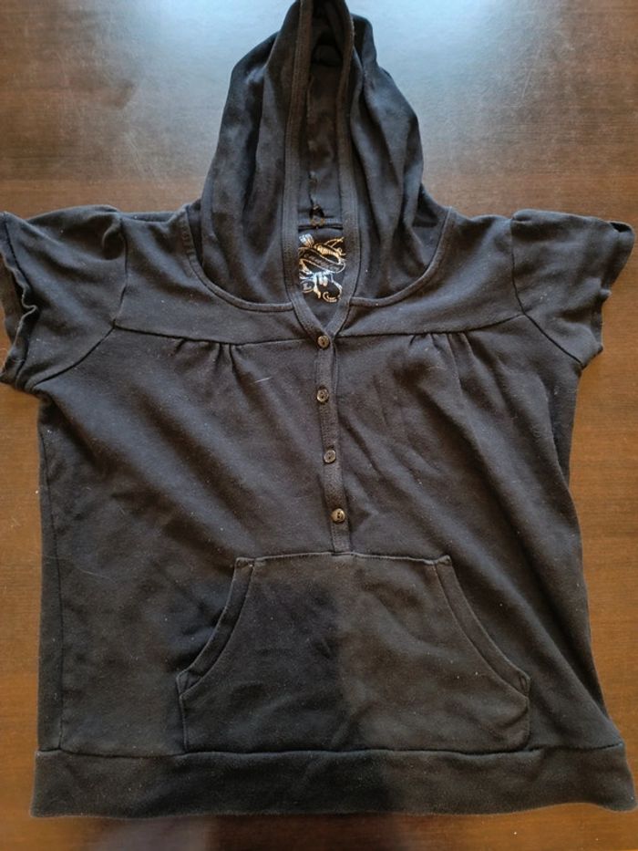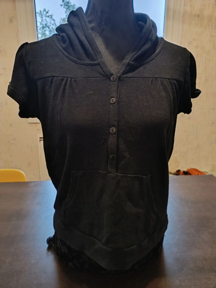 Sweat à capuche JENNYFER Haut boutonné Manche courtes Poche ventrale 100% Coton TAILLE L TRES BON ETAT ( Il est bien noir c'est un effet de la photo ) Allez voir mes autres ventes!