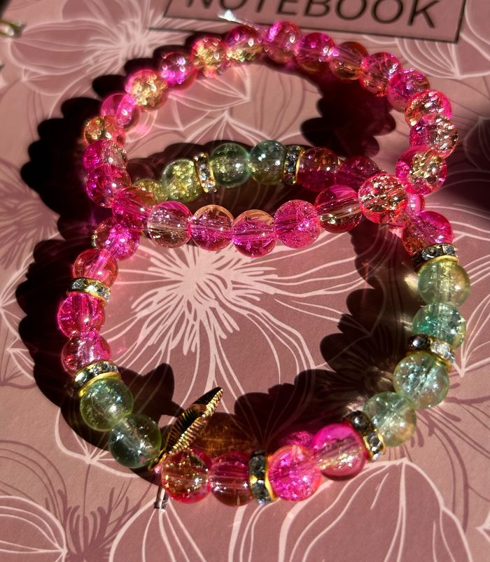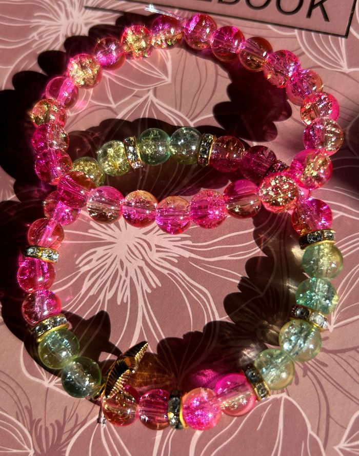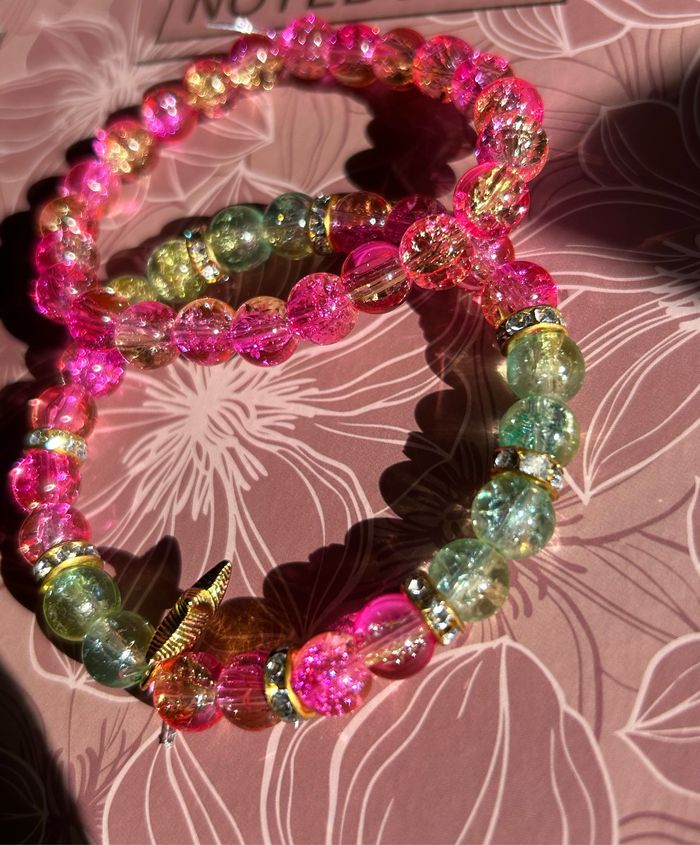 Ce duo de bracelets se compose d'un premier bracelet aux teintes vert clair et rose, orné de motifs dorés et d'un pendentif en forme d'étoile de mer. Le deuxième bracelet est entièrement rose, offrant une belle complémentarité. Ces bracelets ajoutent une touche de couleur et d'élégance à votre style.