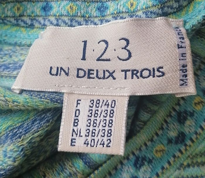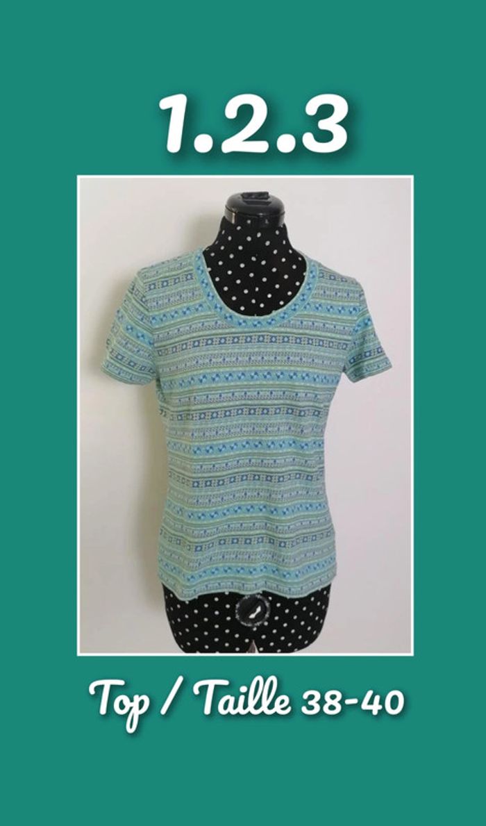⏩ Tous mes tops => #bizs33top ⏩Tous mes articles en taille 38 => #bizs33taillem Joli top bleu turquoise et jaune Imprimé géométrique / ethnique Col rond, manches courtes Tissu non extensible Pas de doublure 1.2.3 Taille 38/40 = M/L Composition : 100% Coton Mesures à plat fermé : Longueur : 58 cm Epaules : 38 cm Aisselles : 44 cm Taille : 41 cm Prix d'achat ~ 45€ 🌟 Porté quelques fois mais en très bon état général 🌟 🎁🎁🎁 Profitez d'un article offert, avec votre commande, voir les détails dans mon 'à propos' 🎁🎁🎁 #fashion #hippiechic #hippie #haut #jaune #bleu #turquoise #ethnique #top #haut #bizs33taille40 #bizs33taille38 #1.2.3 #bizs33taillem #bizs33taillel #teeshirtfemme #bizs33top #bizs33 P24N20