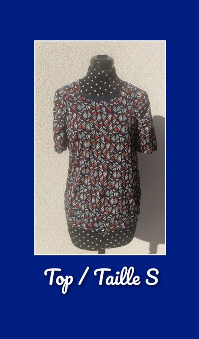 Top / tee-shirt géométrique bleu orange bordeaux crème Taille S - photo numéro 1