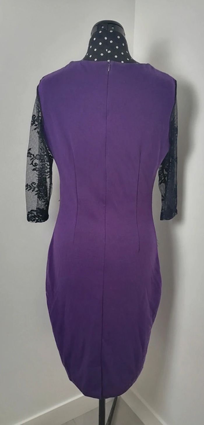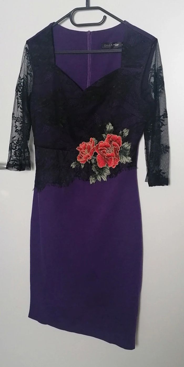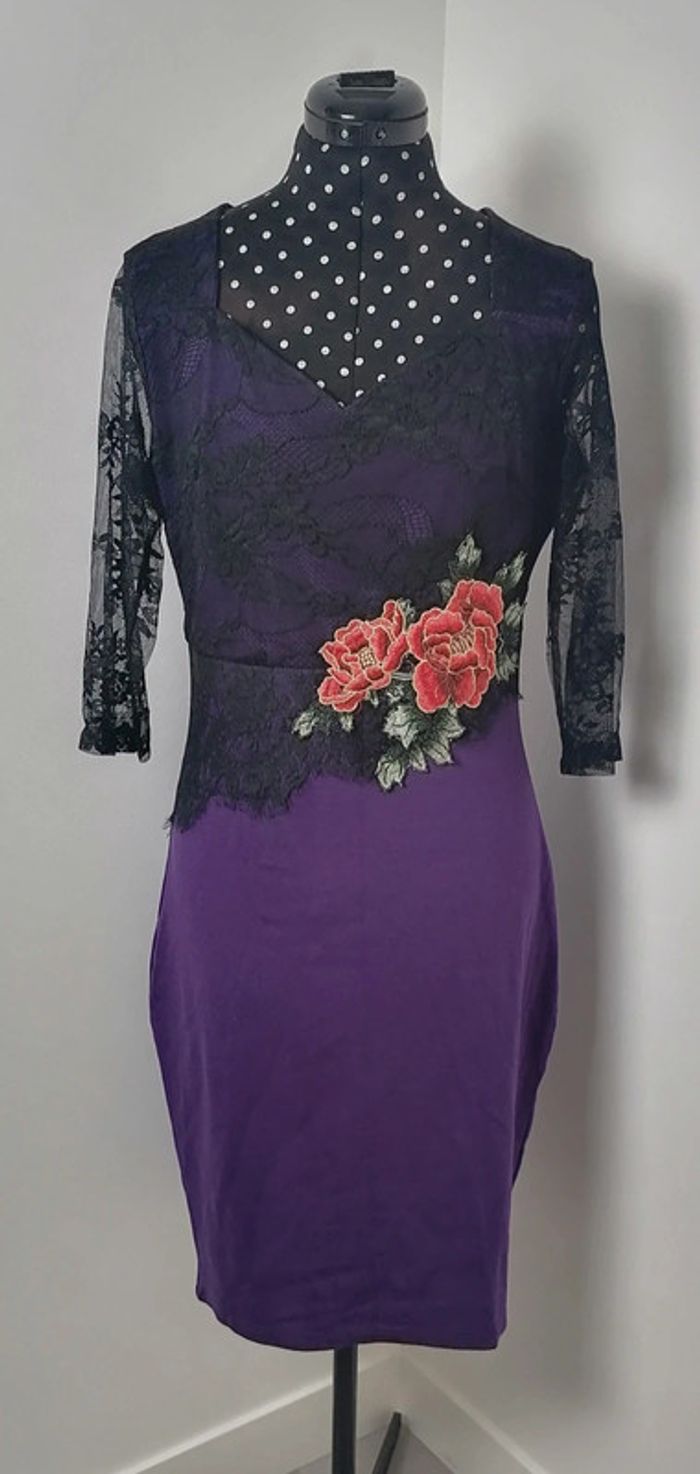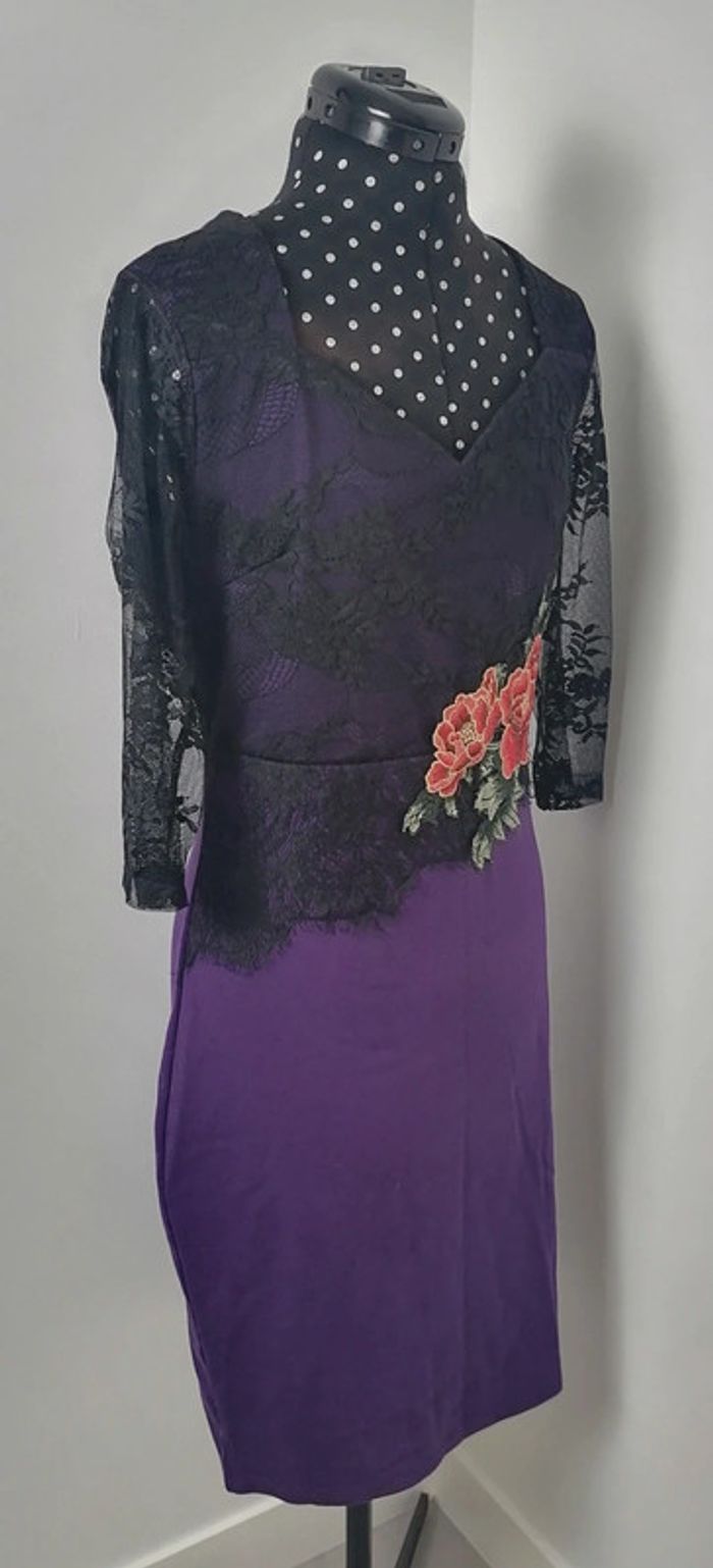 Robe moulante violet dentelle noire broderie fleurs rouge vert Taille XL Oxiuli Fashion - photo numéro 2