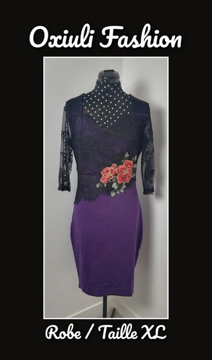 Robe moulante violet dentelle noire broderie fleurs rouge vert Taille XL Oxiuli Fashion - photo numéro 1