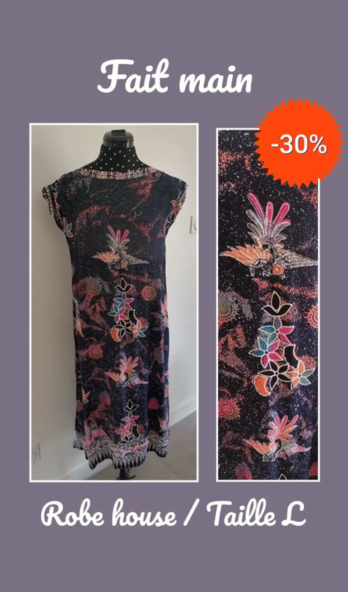 💥 PROMO 💥 Prix initial : 12€ Prix réduit : 8€ Jolie robe d'été légère, imprimé ciel étoilé et fleurs Col rond, manches courtes Fond bleu marine, motif dans les tons rose blanc et orange Pas de fermeture, s'enfile simplement Tissu non extensible, taille non élastique Pas de doublure Fait main, donc pas d'étiquette Taille : convient à un L (voir dimensions en dessous 👇) Matière : à mon avis Coton Mesures à plat : Longueur : 105 cm Epaules : 46 cm Aisselles : 54 cm Taille : 49 cm Hanches : 59 cm Prix d'achat : 55€ 🌟 Portée quelques fois mais très bon état général 🌟 🎁🎁🎁 Promo 1€ offert (en article) par tranche de 5€, voir ma description "à propos" pour lire les détails 🎁🎁🎁 #dress #mode #femme #robe #casual #été #robetaillel #robetaille40 #faitmain #handmade #taille40 #mauve #étoile #fleurs #violet #bleumarine #robechic #robe #bizs33 #bizs33robe #bizs33taillel #bizs33taille40 P20N01
