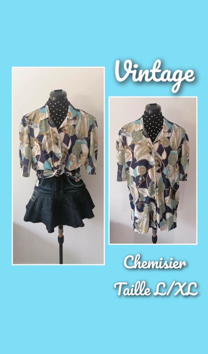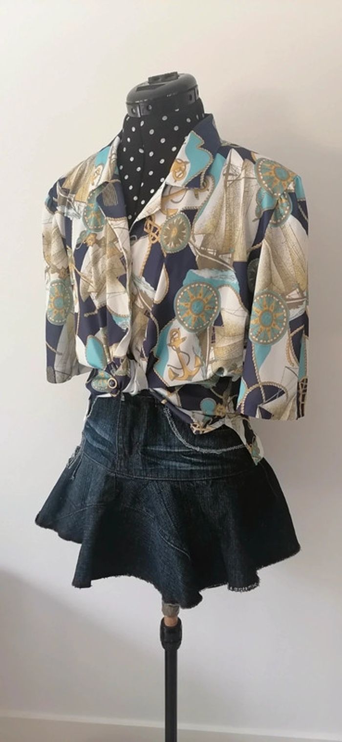 Jolie blouse / chemisier fluide à imprimé marin (boussoles, noeuds marins, ancres...) Vrai Vintage, très sympa à porter oversize ! Fond blanc, motif jaune, turquoise et marine Fermeture boutonnière Manches 1/2, col chemise, épaulettes Tissu non stretch, se porte fluide Pas de doublure Taille : pas d'étiquette, convient à un L/XL (dimensions en dessous 👇) Composition : pas d'étiquette, à mon avis Polyester Mesures à plat : Épaules : 43 cm Aisselles : 60 cm Longueur : 73 cm Prix d'achat : 55 € 🌟 Vintage mais en très bon état général 🌟 🎁🎁🎁 Promo 1€ offert (en article) par tranche de 5€, voir ma description "à propos" pour lire les détails 🎁🎁🎁 #teeshirt #fashion #top #haut #tshirt #blouse #teeshirttaille40 #taille40 #chemisier #vintage #topfemme #chic #doré #haut #jaune #bijoux #bleu #marine #turquoise #bizs33taille40 #bizs33taillel #bizs33taillexl #bizs33taille42 #teeshirtfemme #bizs33top #bizs33 P19N55