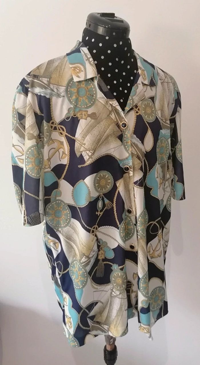 Chemisier marin boussoles, noeuds, ancres blanc bleu turquoise Taille L / XL oversize Vintage - photo numéro 1