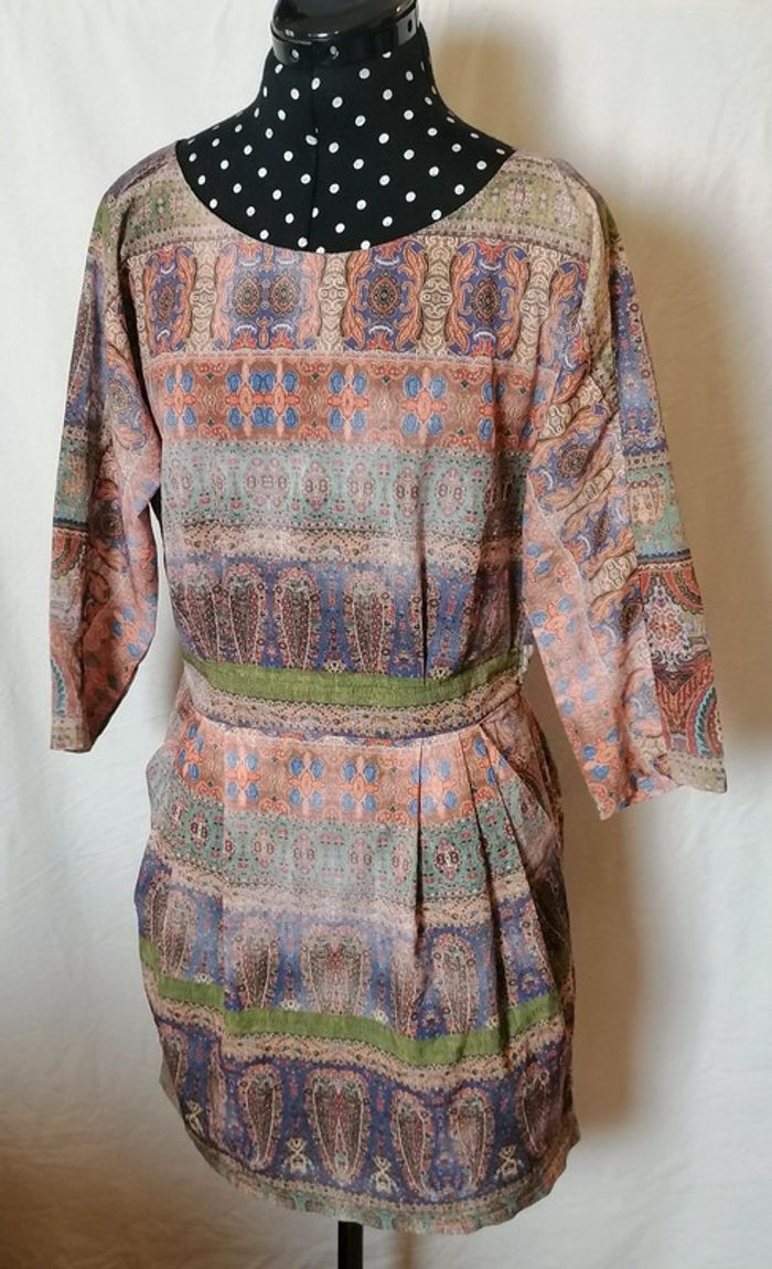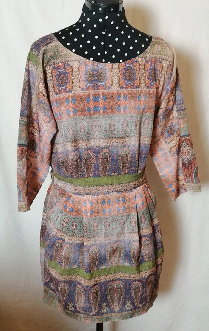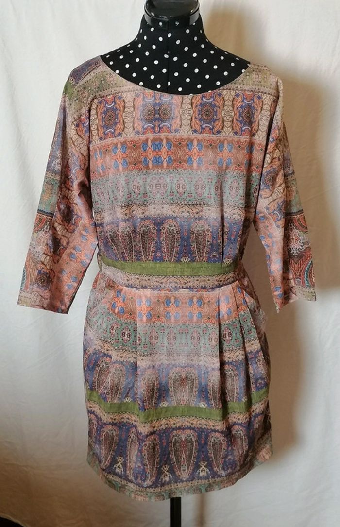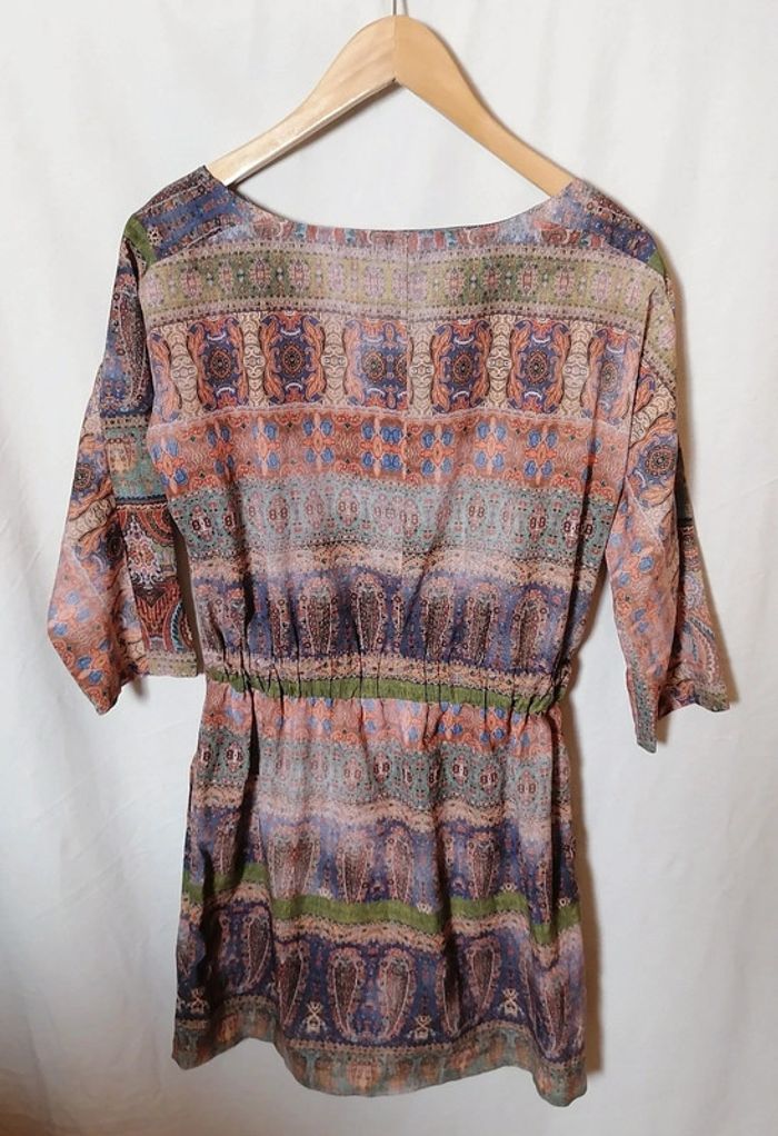 Superbe robe courte, légere, fluide Motif byzantin Couleurs principales : orange, violet et vert Col rond, manches longues Poches latérales Pas de fermeture, s'enfile simplement Tissu non stretch, taille élastique Pas de doublure MNG Collection Taille M Composition : 100% Polyester Mesures à plat : Longueur : 85 cm Épaules : 43 cm Aisselles : 54 cm Taille : 35 -> 45 cm (élastique) Hanches : 55 cm Prix d'achat ~ 55 € 🌟 Peu portée, très bon état général 🌟 #dress #mode #femme #robe #casual #taillem #robetaillem #mng #mango #robetaille38 #taille38 #casual #orange #vert #violet #robe #bizs33 #bizs33robe #bizs33taillem #bizs33taille38 P20N27