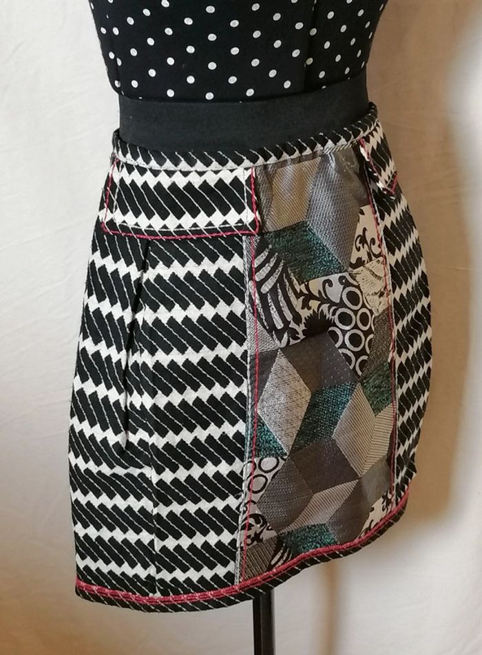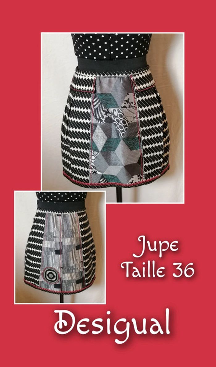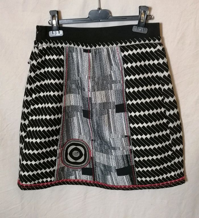 Jupe courte patchwork écusson cuir argenté noir blanc rouge taille 36 Desigual - photo numéro 1