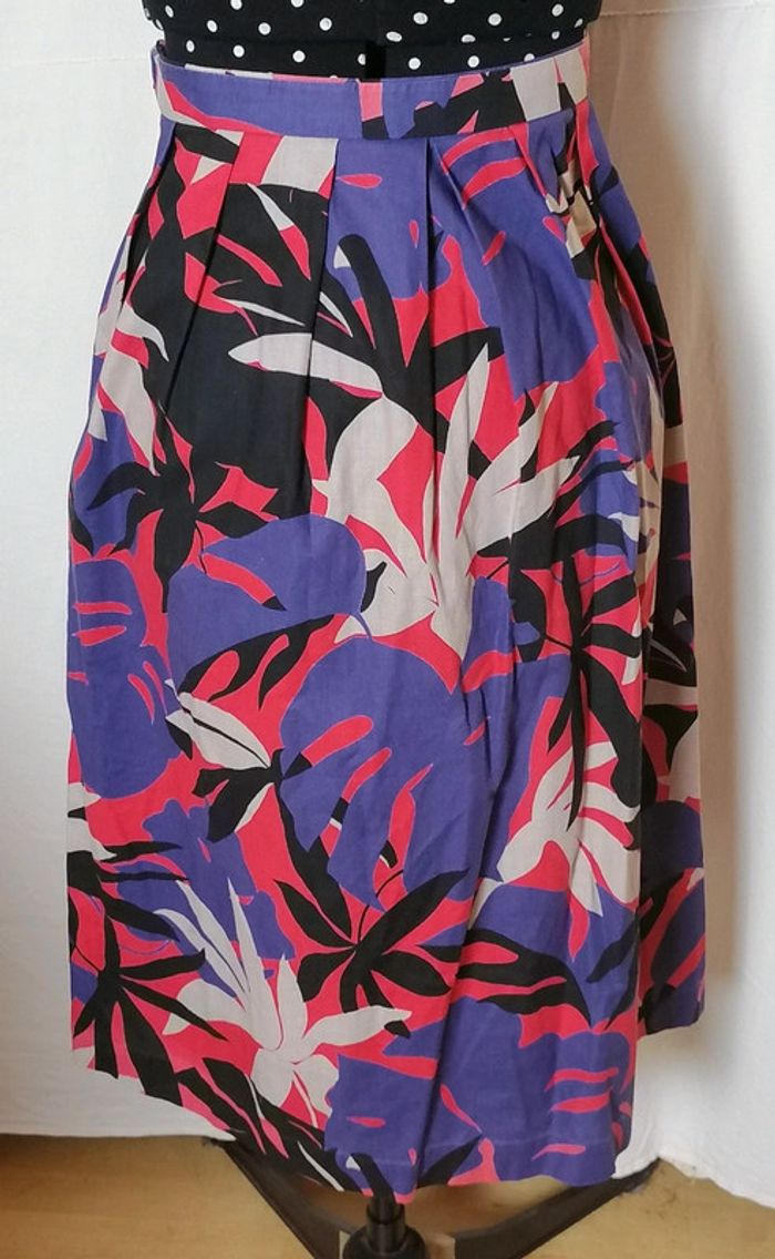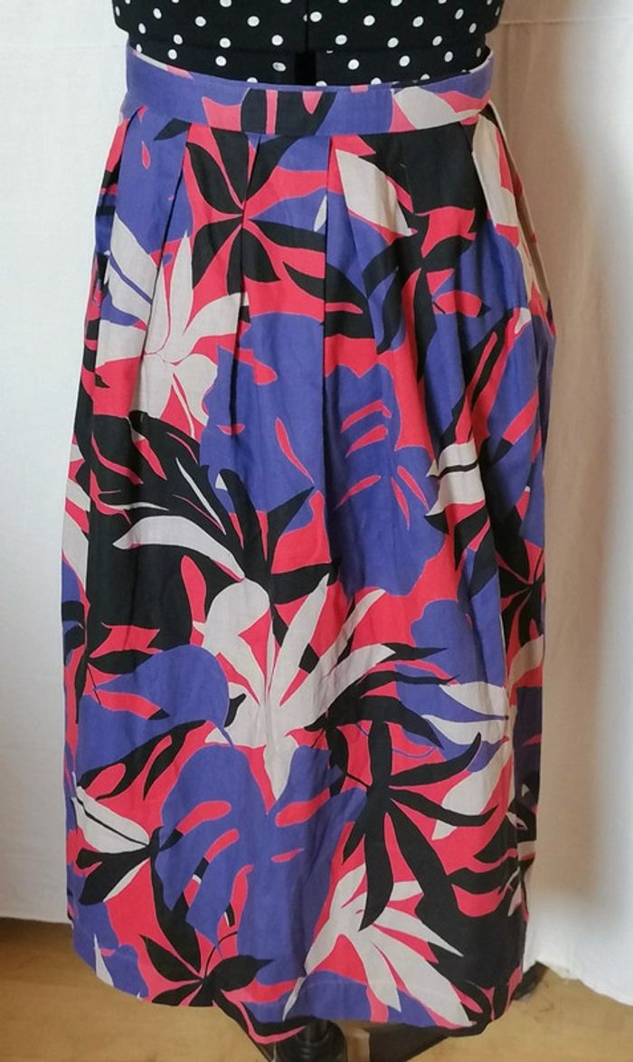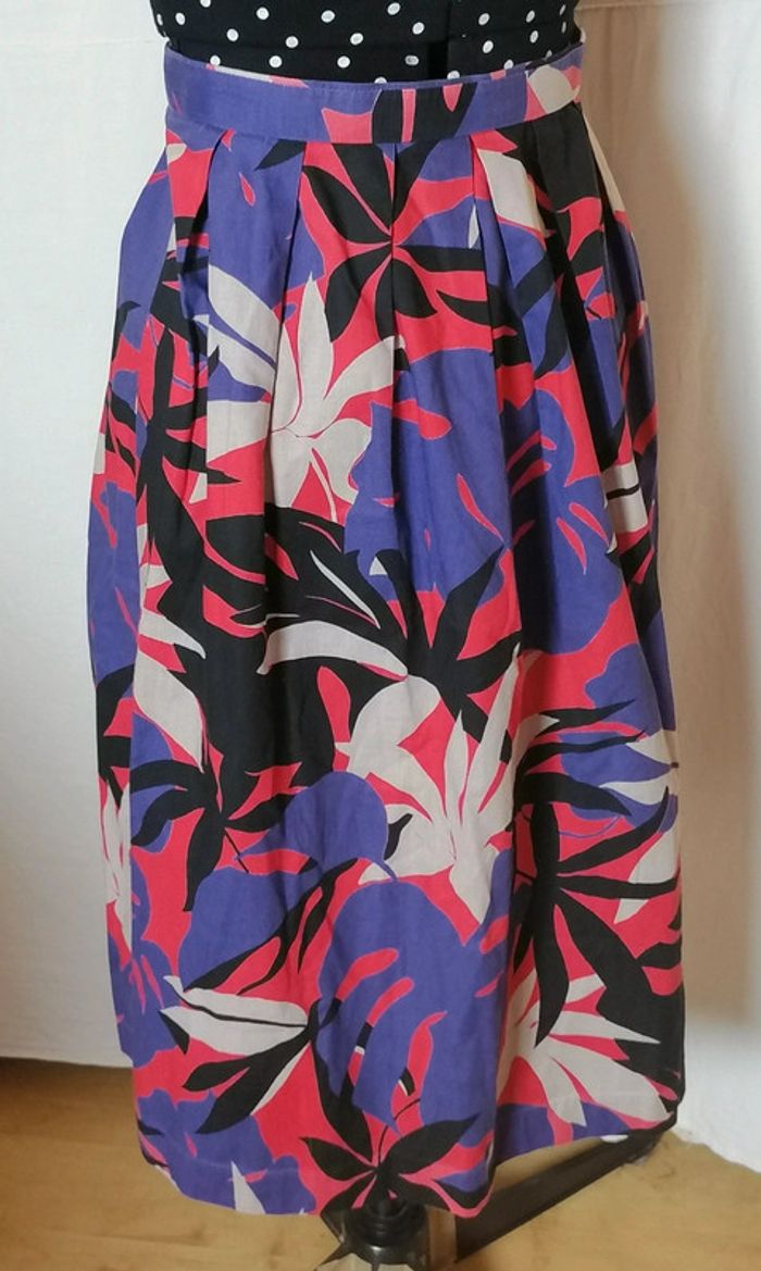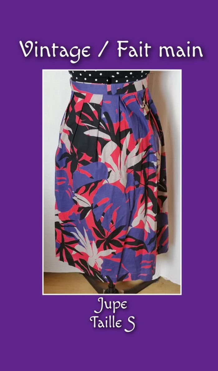 Jupe mi-longue motif tropical violet rouge noir gris taille S fait main Vintage